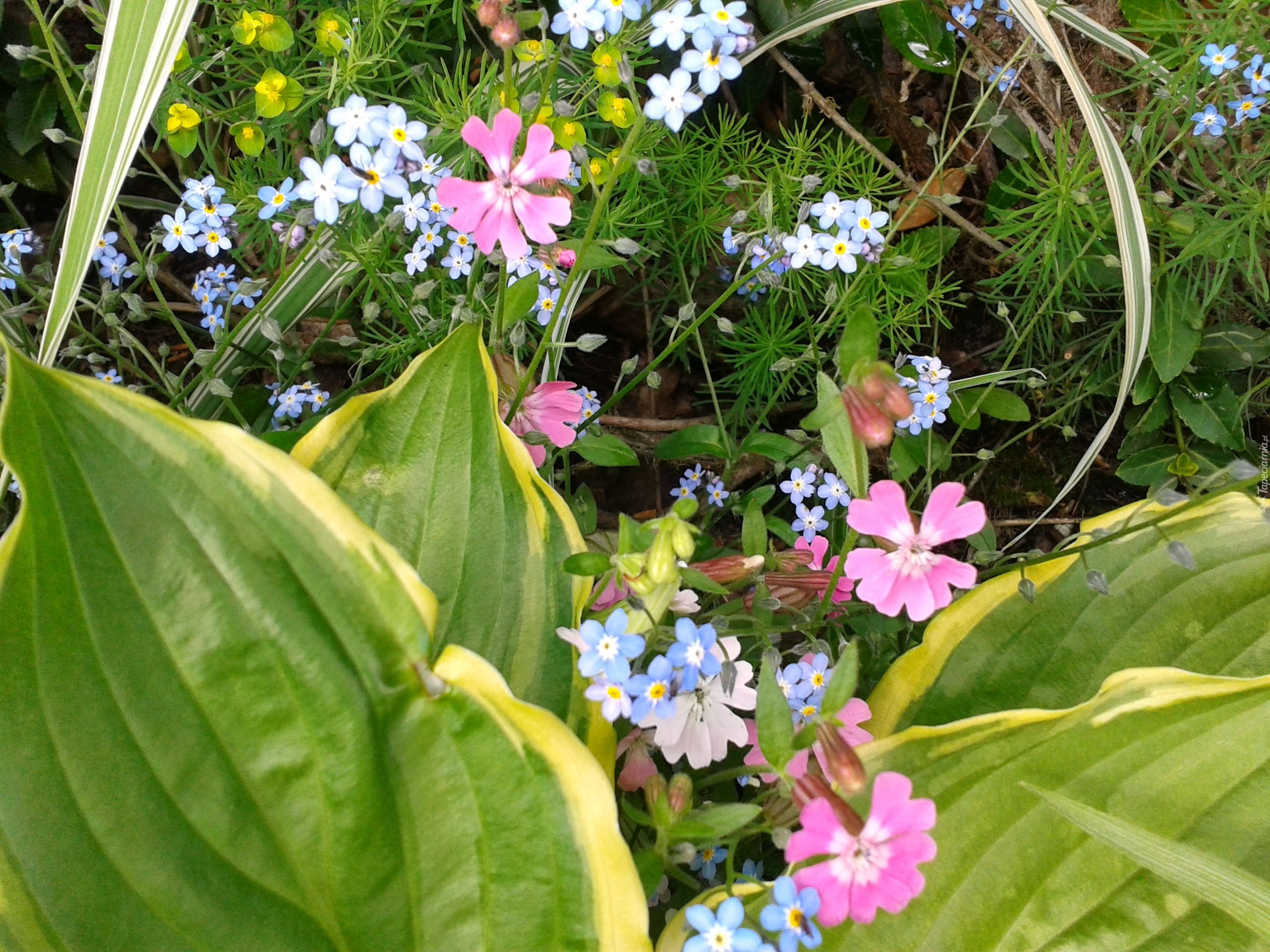 Edytor tapety: Niezapominajka, Niebieska, Różowe Kwiatki, Zielone Liście