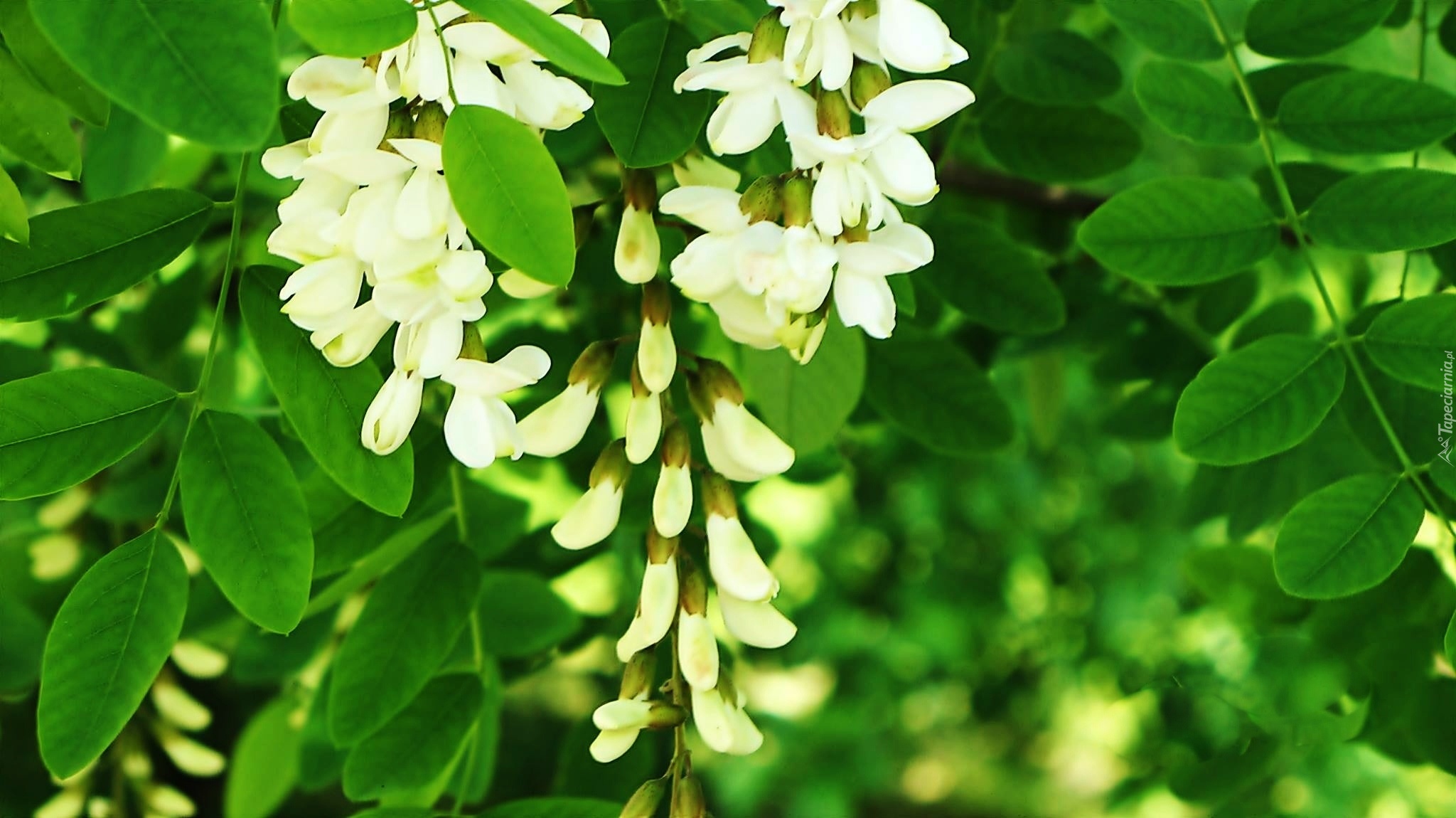 Edytor tapety: Akacja, Białe, Kwiaty, Liście