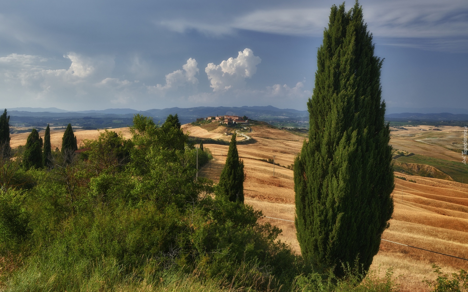 Edytor tapety: Drogi, Wzgórza, Domy, Drzewa, Góry, Toskania, Włochy
