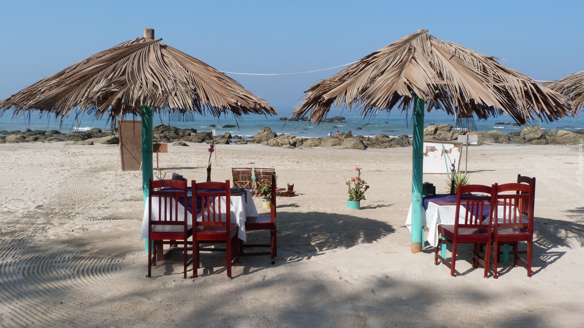 Edytor tapety: Stoliki, Parasole, Plaża, Morze, Kamienie, Wakacje