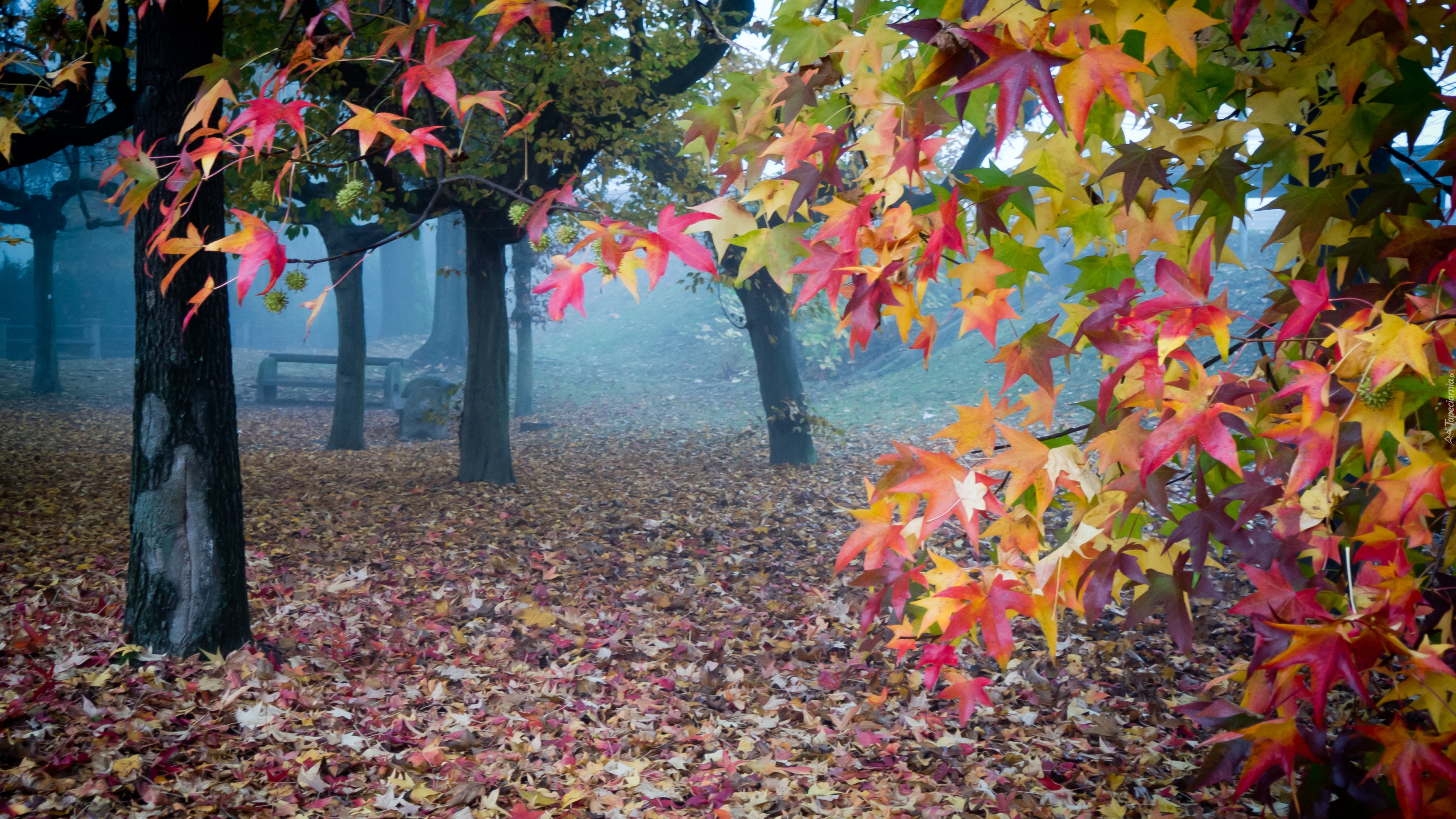 Edytor tapety: Park, Drzewa, Liście, Ławka, Mgła, Jesień