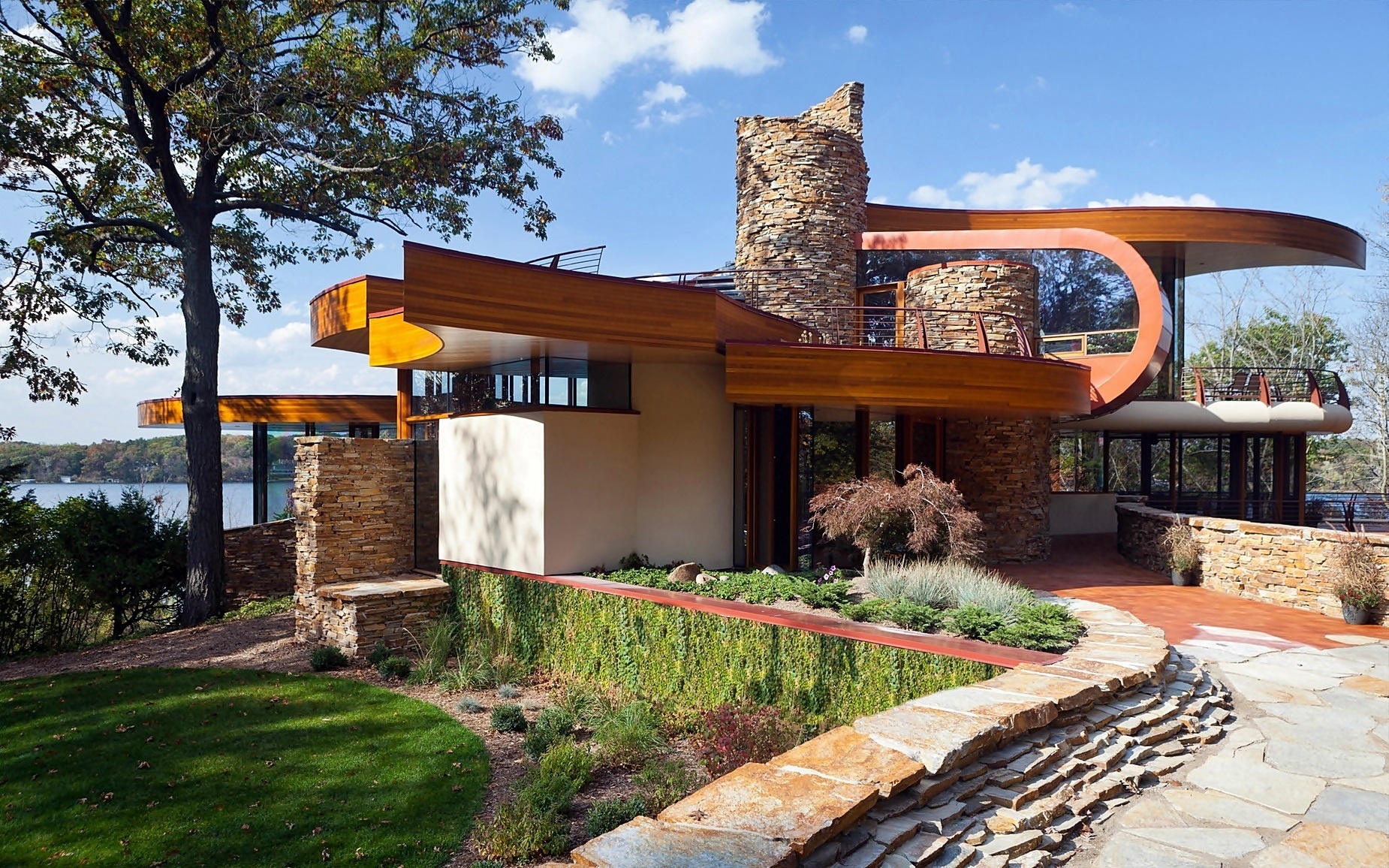 Edytor tapety: Nowoczesna, Willa, Drzewa, Jezioro