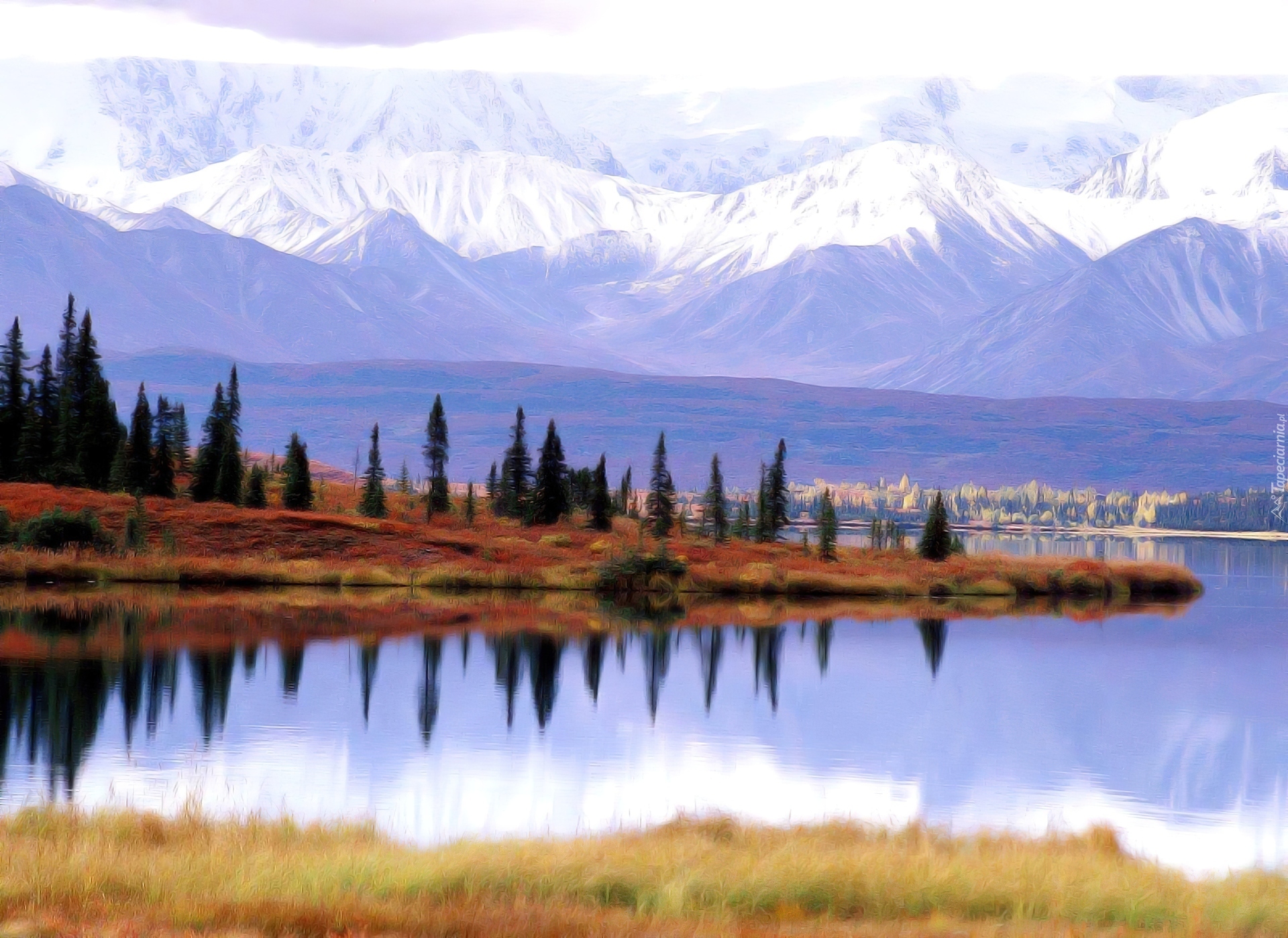 Edytor tapety: Jezioro, Góry, Świerki