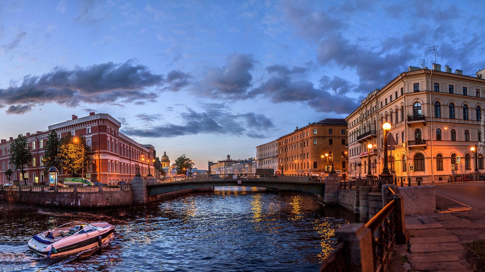 Edytor tapety: Rzeka, Most, Motorówka, Budynki, Latarnie, Miasto, Zmierzch