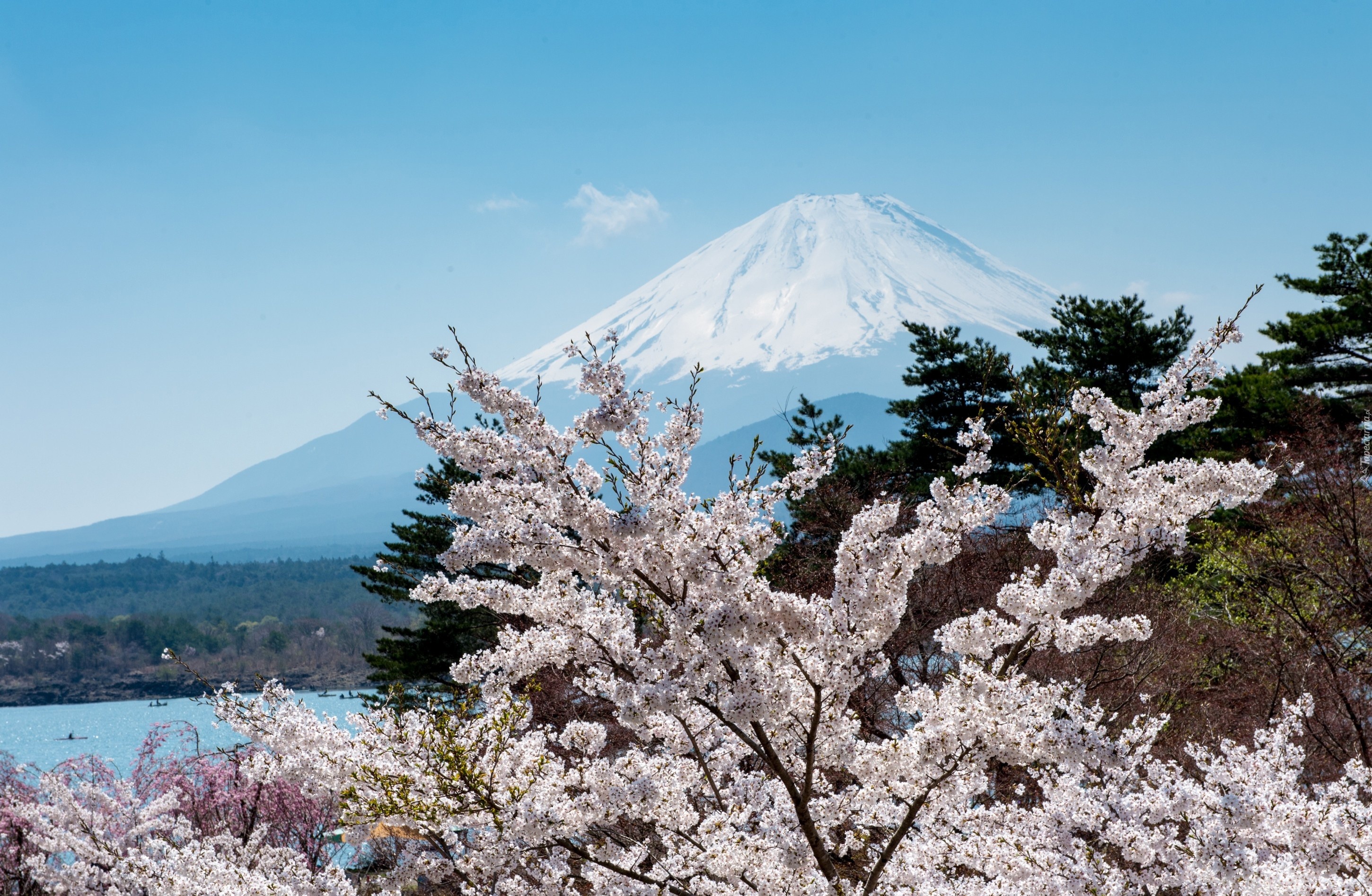 Edytor tapety: Fudżi, Kwitnące, Drzewa, Japonia, Wiosna