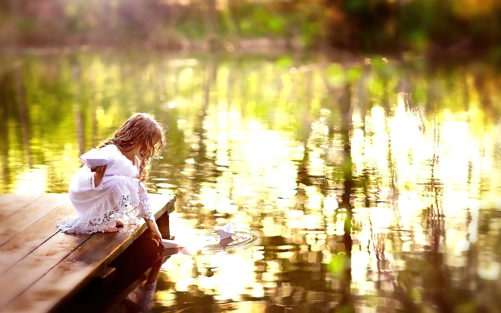 Edytor tapety: Dziewczynka, Pomost, Jeziorko, Staw, Papierowe, Statki