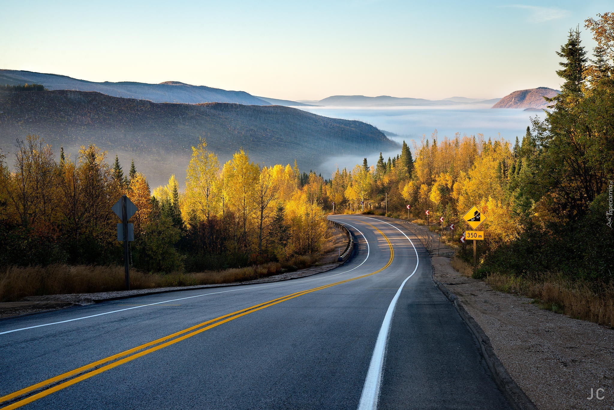 Edytor tapety: Droga, Drzewa, Góry, Mgła