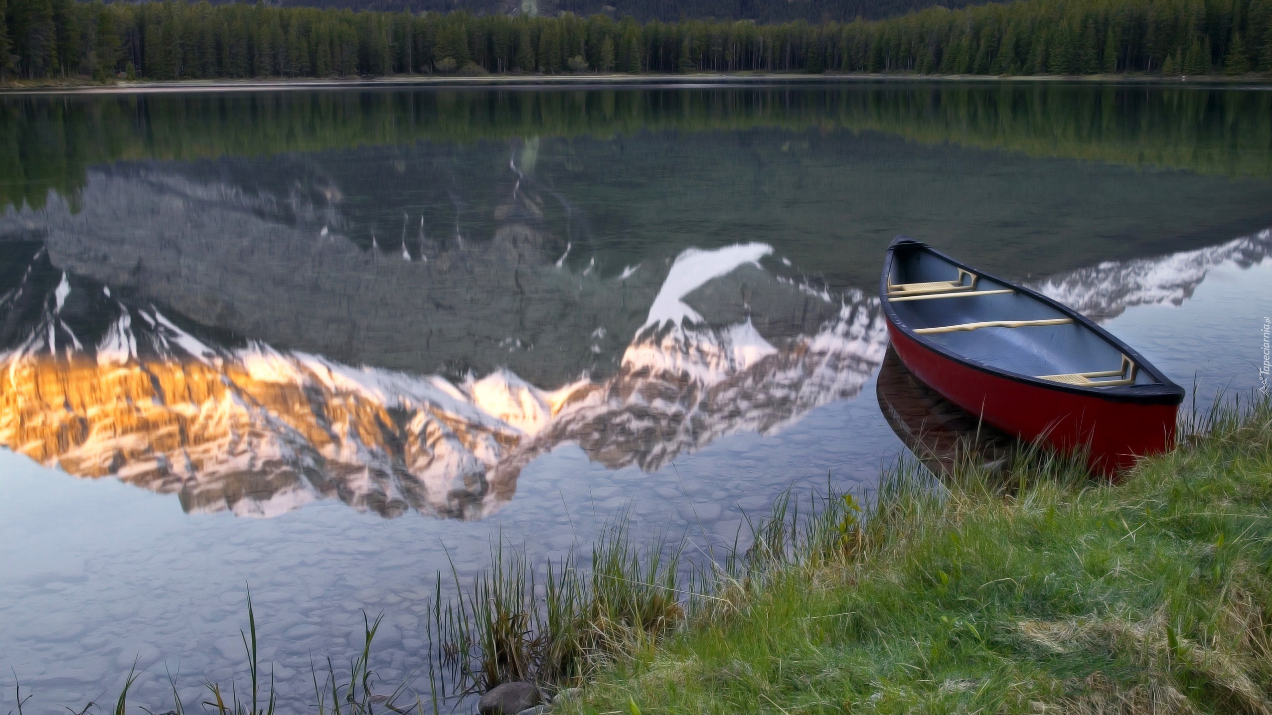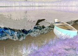 Edytor tapety: Jezioro, Brzeg, Łódka, Trawa, Drzewa, Odbicie