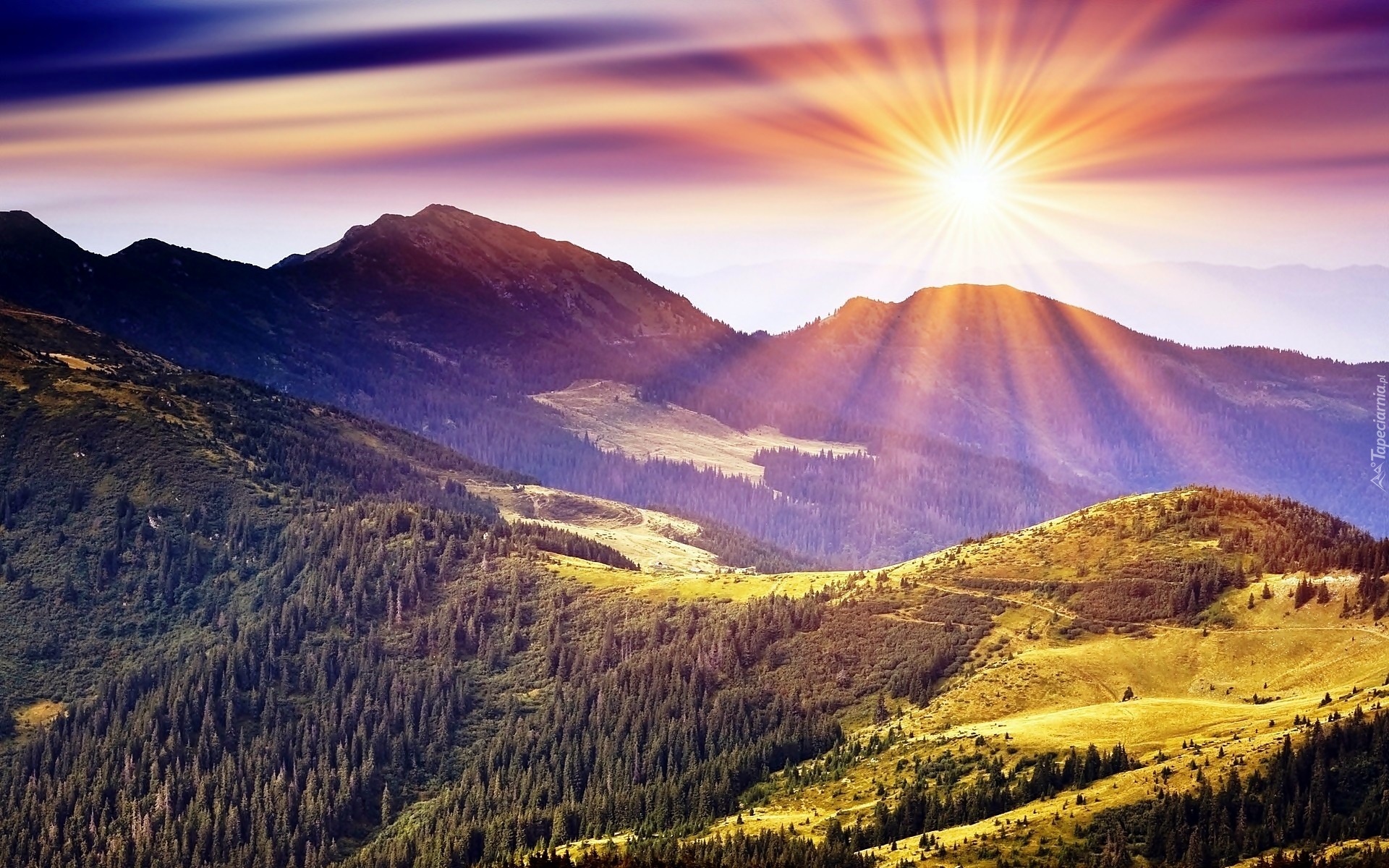 Edytor tapety: Góry, Lasy, Łąki, Promienie, Słońca