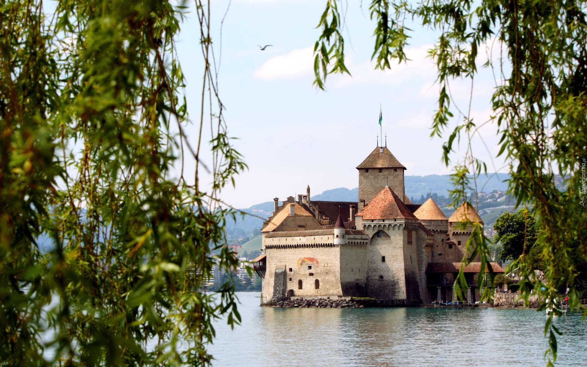 Edytor tapety: Zamek Chillon, Château de Chillon, Jezioro Genewskie, Kanton Vaud, Szwajcaria, Gałęzie, Drzewa