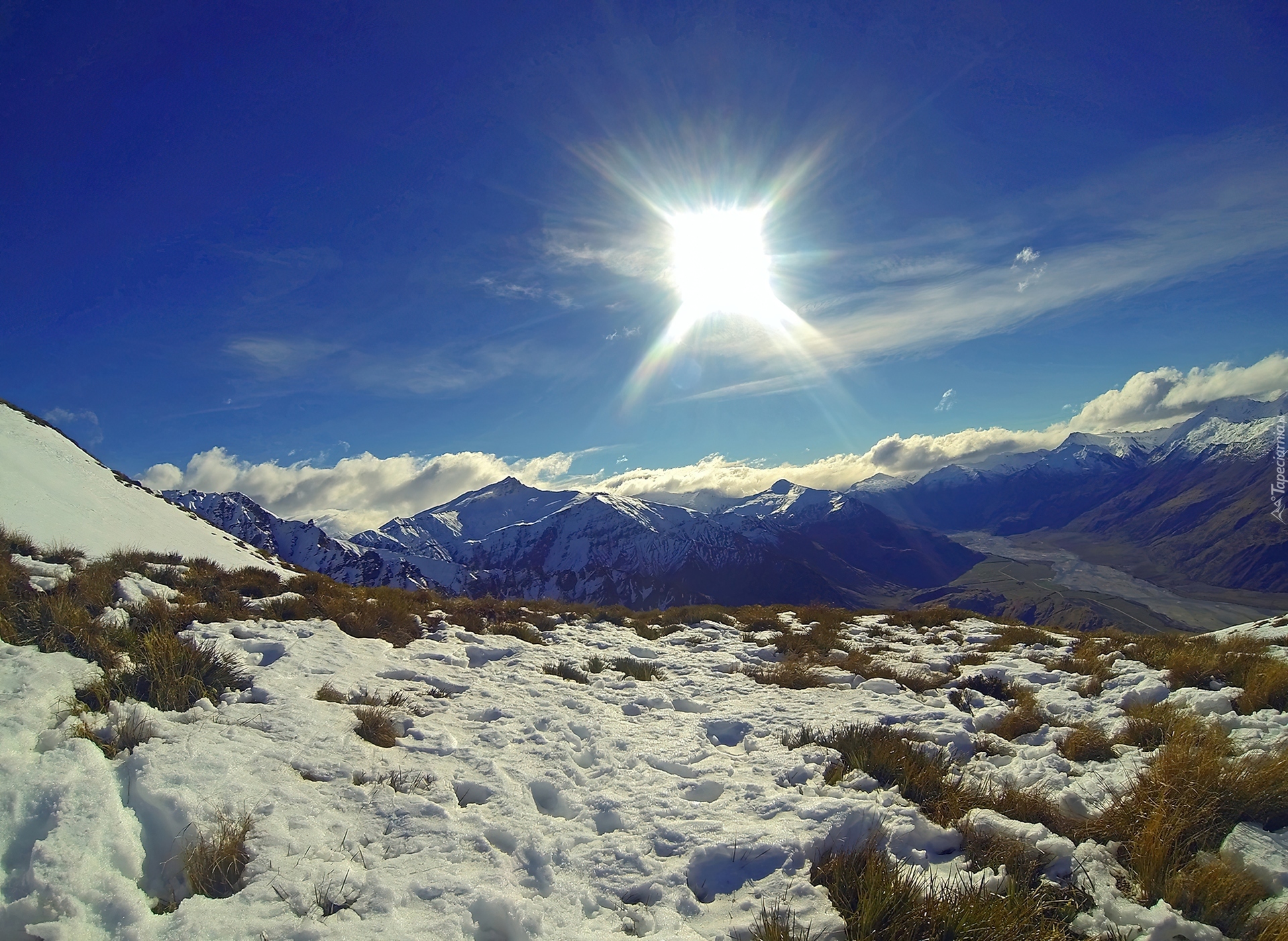 Edytor tapety: Zima, Śnieg, Góry, Chmury, Promienie, Słońca