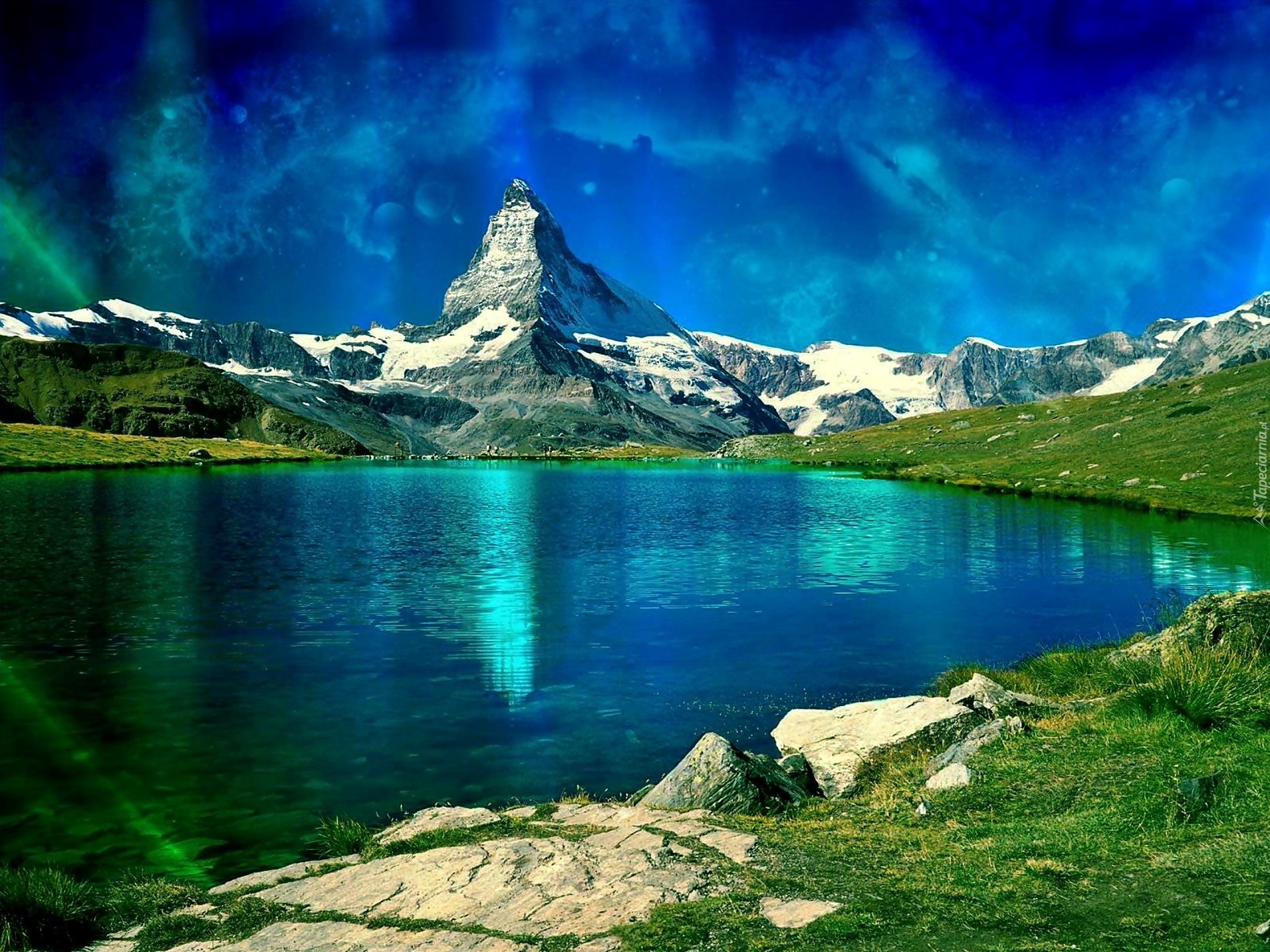 Edytor tapety: Chmury, Góry Jezioro, Łąka
