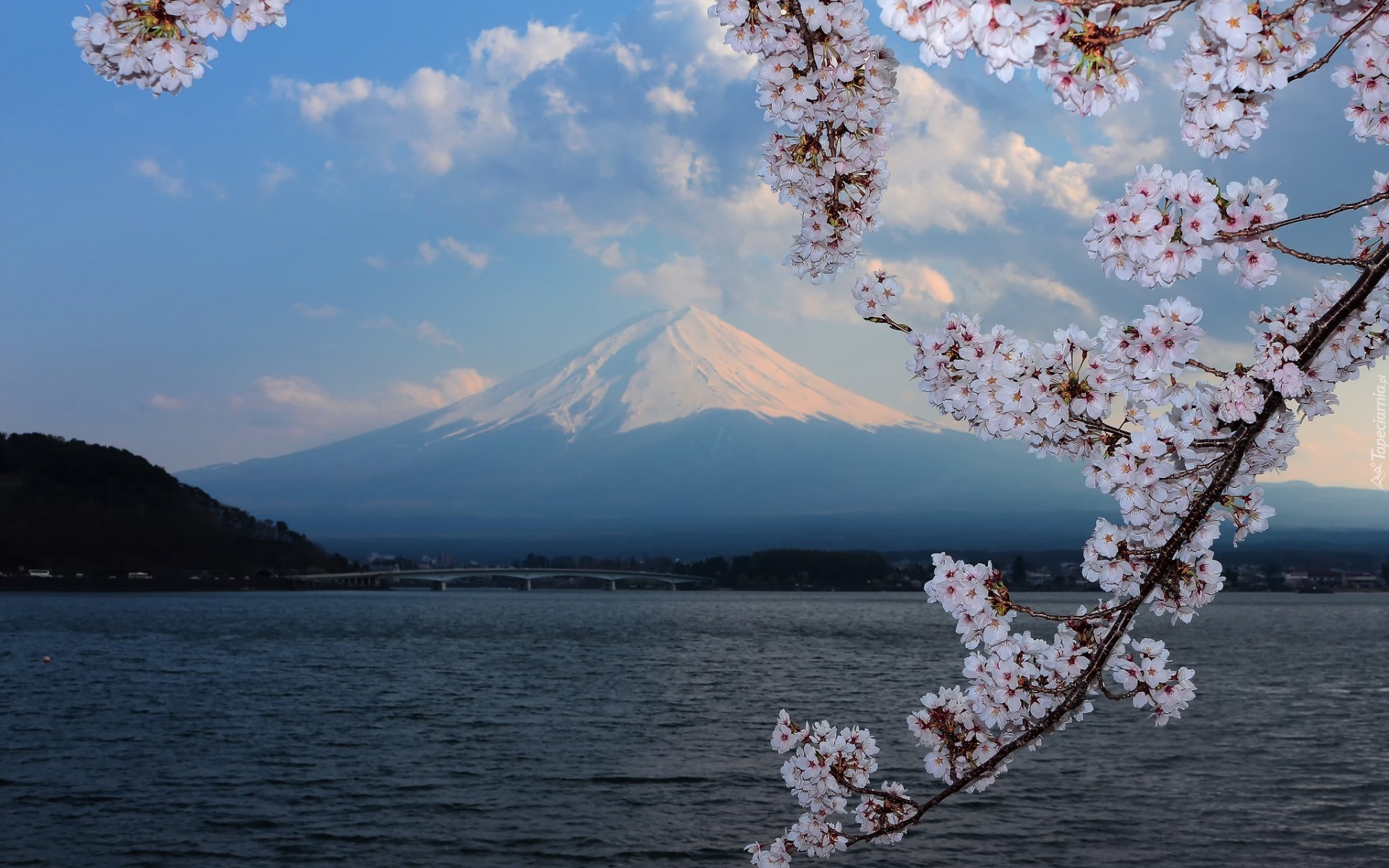 Edytor tapety: Góra, Fudżi, Wulkan, Jezioro, Most, Kwitnące, Drzewo, Japonia