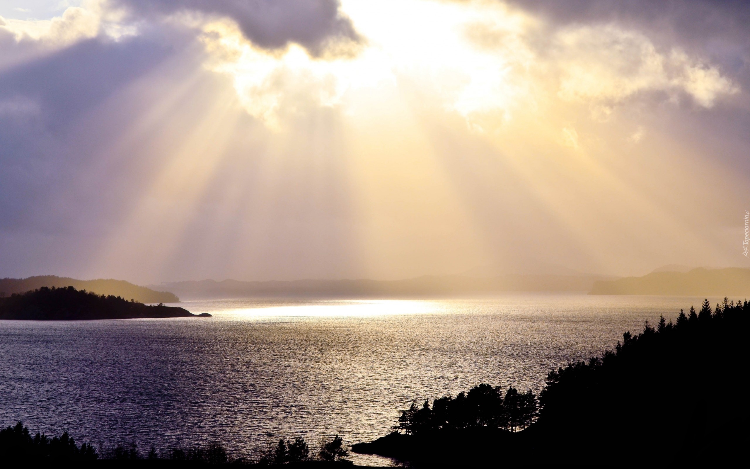 Edytor tapety: Jezioro, Góry, Lasy, Chmury, Promienie, Słońca