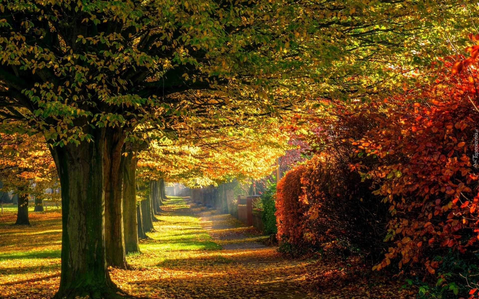 Edytor tapety: Park, Aleja, Drzewa, Liście, Przebijające, Światło, Jesień