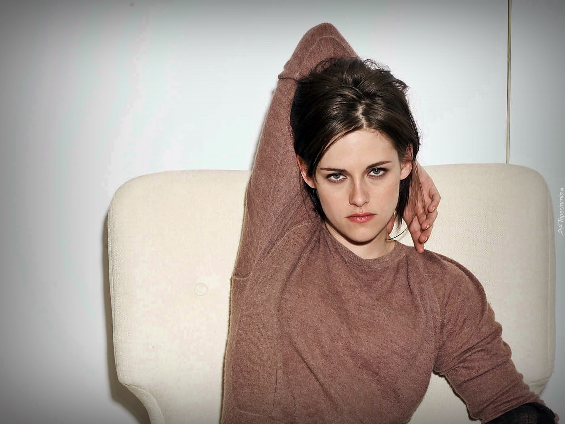 Edytor tapety: Kristen, Stewart, Aktorka, Sweterek, Uniesiona, Ręka