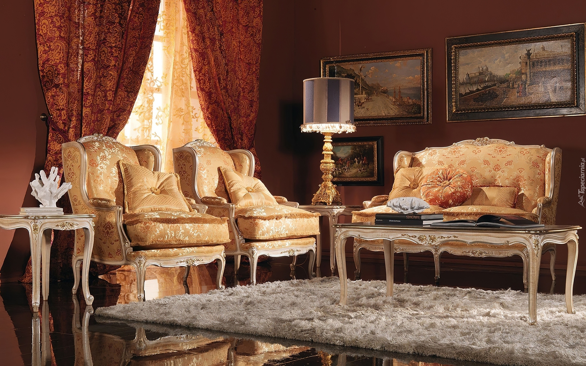 Edytor tapety: Stylowy, Pokój, Fotele, Lampa, Obrazy, Dywan, Okno