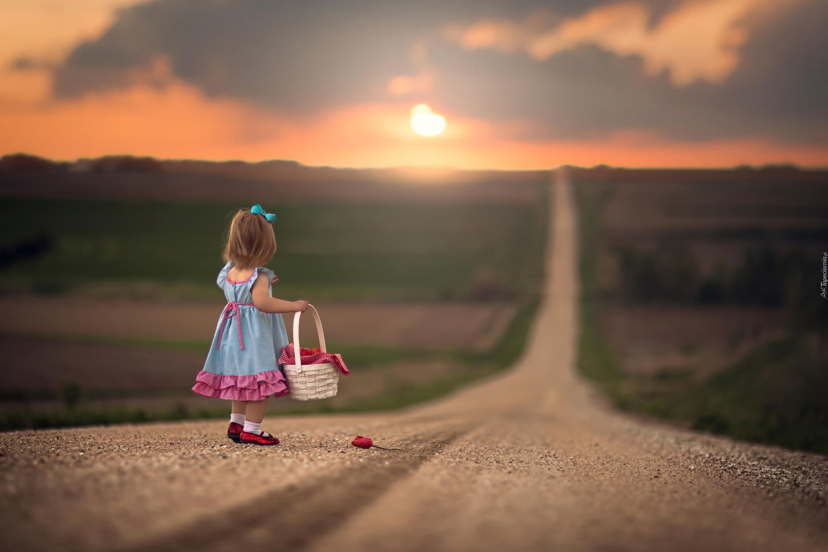 Edytor tapety: Droga, Zachód, Słońca, Dziewczynka, Koszyczek