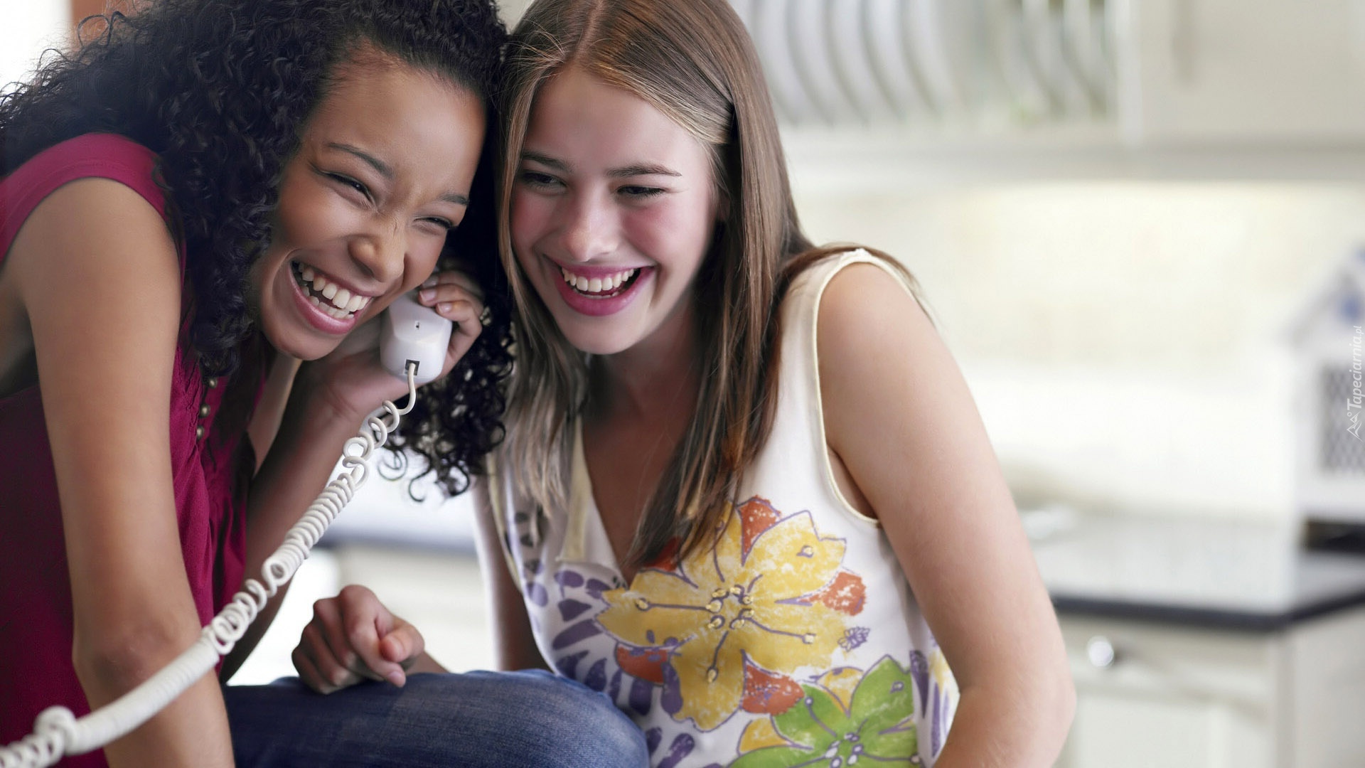 Edytor tapety: Dwie, Uśmiechnięte, Kobiety, Telefon, Rozmowa