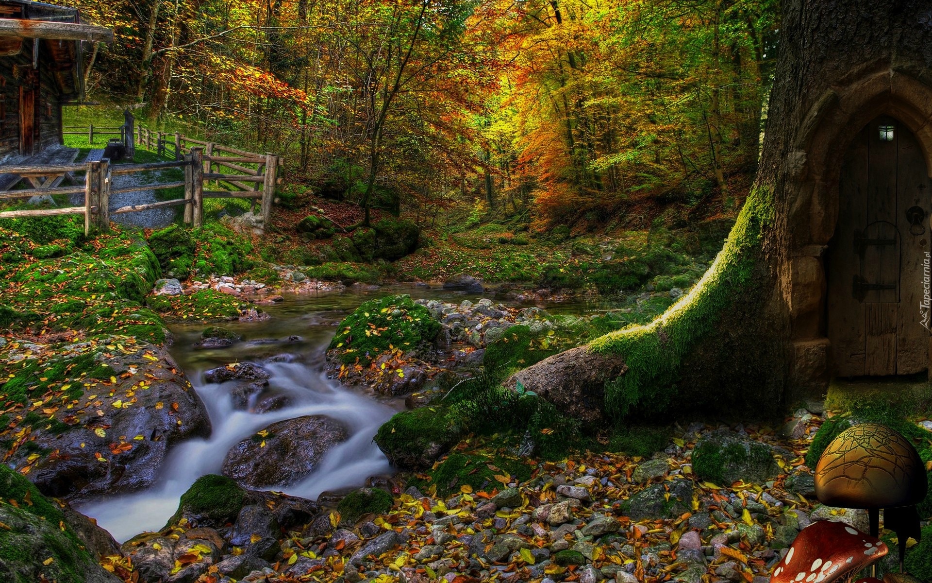 Edytor tapety: Potok, Kamienie, Liście, Drzewa, Domek, Las, Jesień