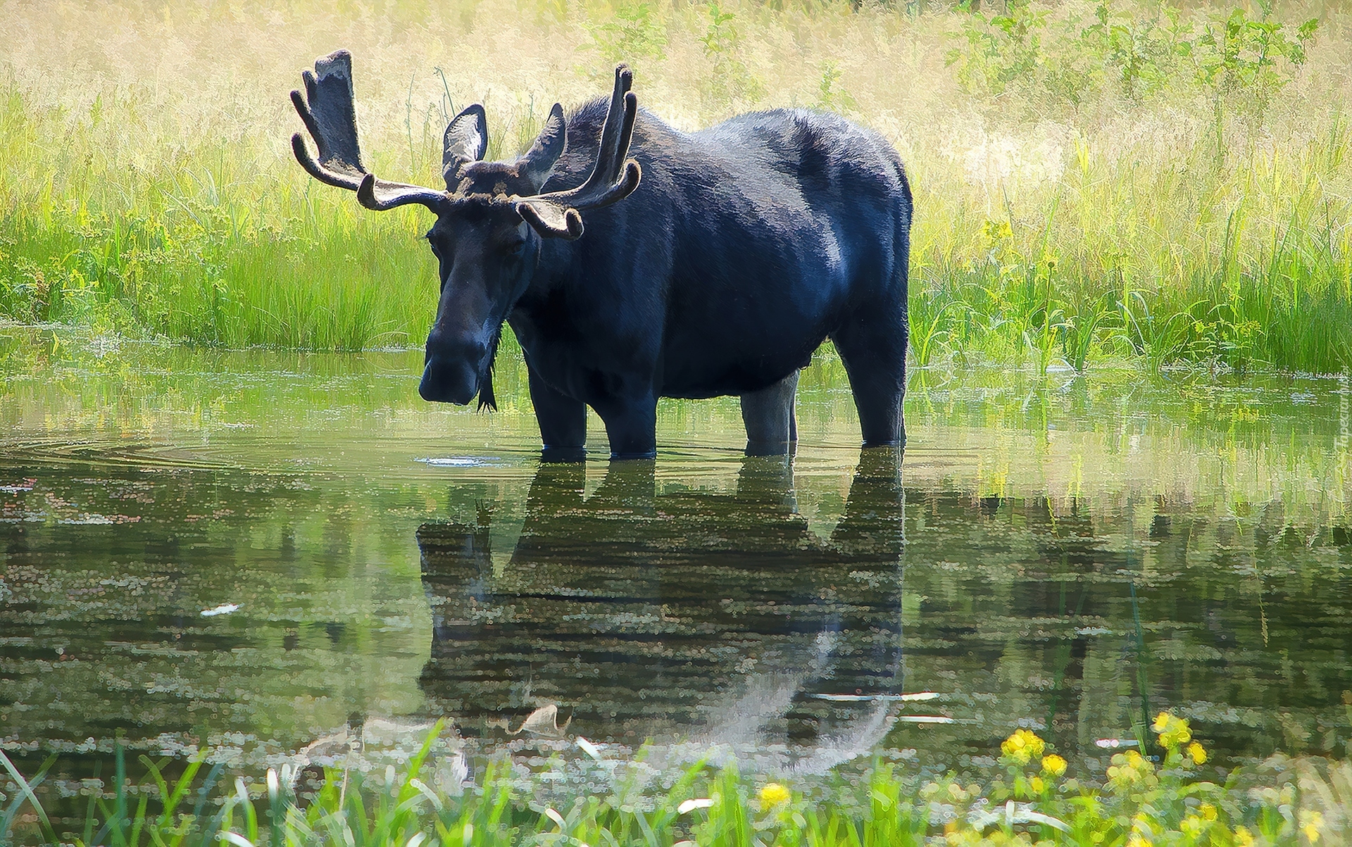 Edytor tapety: Łoś, Łąka, Trawy, Woda