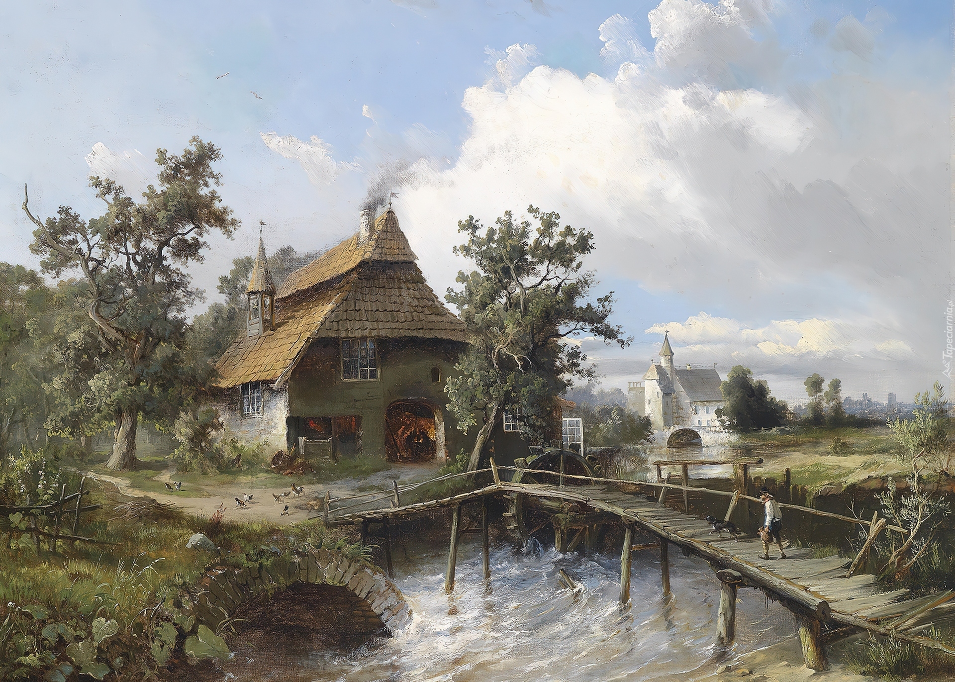 Edytor tapety: Malarstwo, Obraz, Wieś, Dom, Młyn, Most, Rzeka