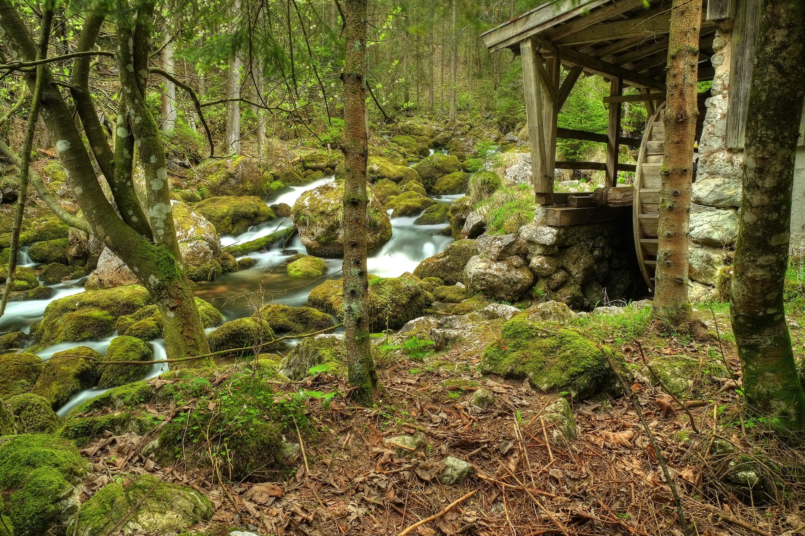 Edytor tapety: Las, Rzeka, Kamienie, Młyn