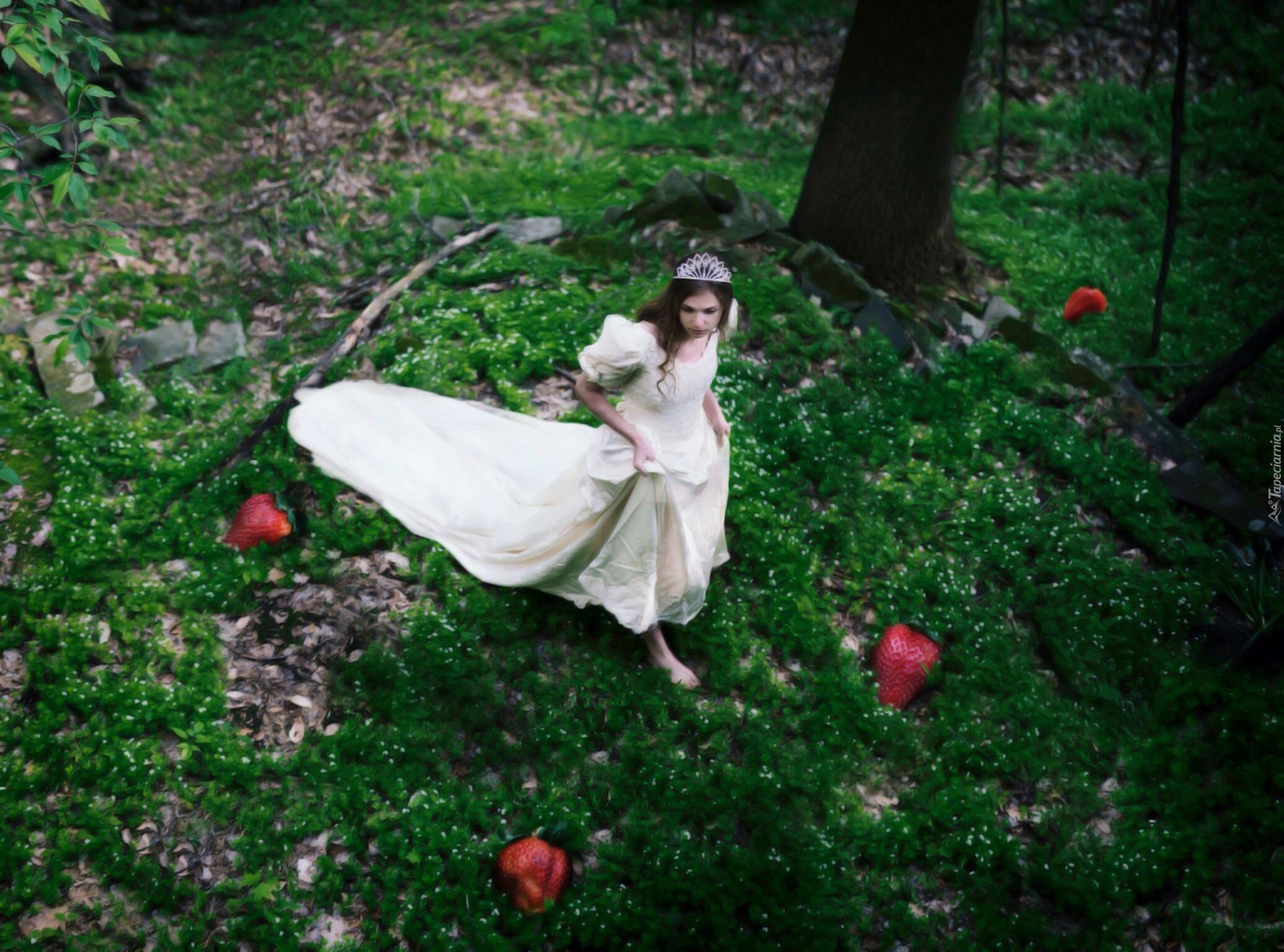 Edytor tapety: Kobieta, Biała, Suknia, Panna młoda, Truskawki, Las