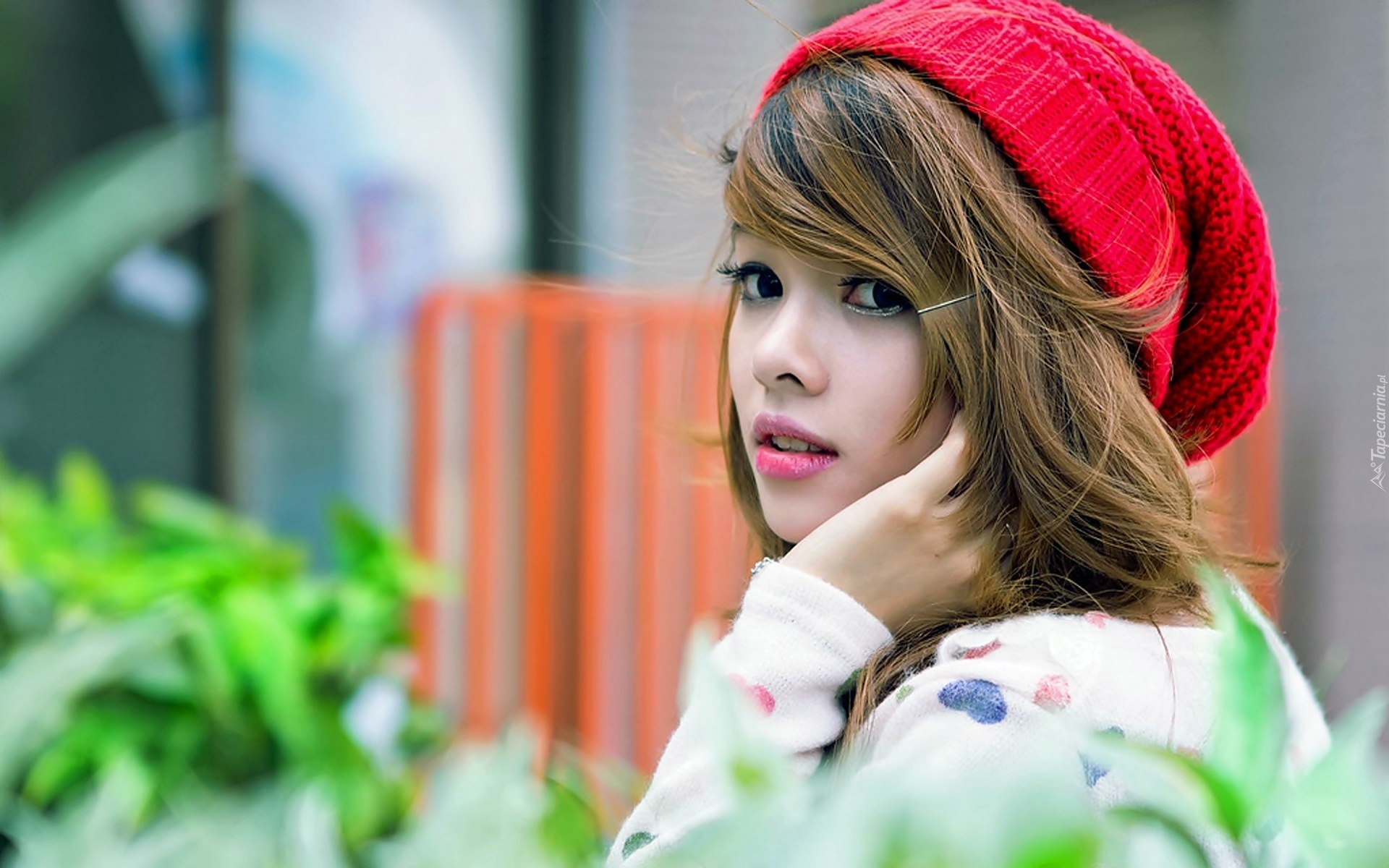 Edytor tapety: Dziewczyna, Azjatka, Czerwony, Beret, Rozmycie