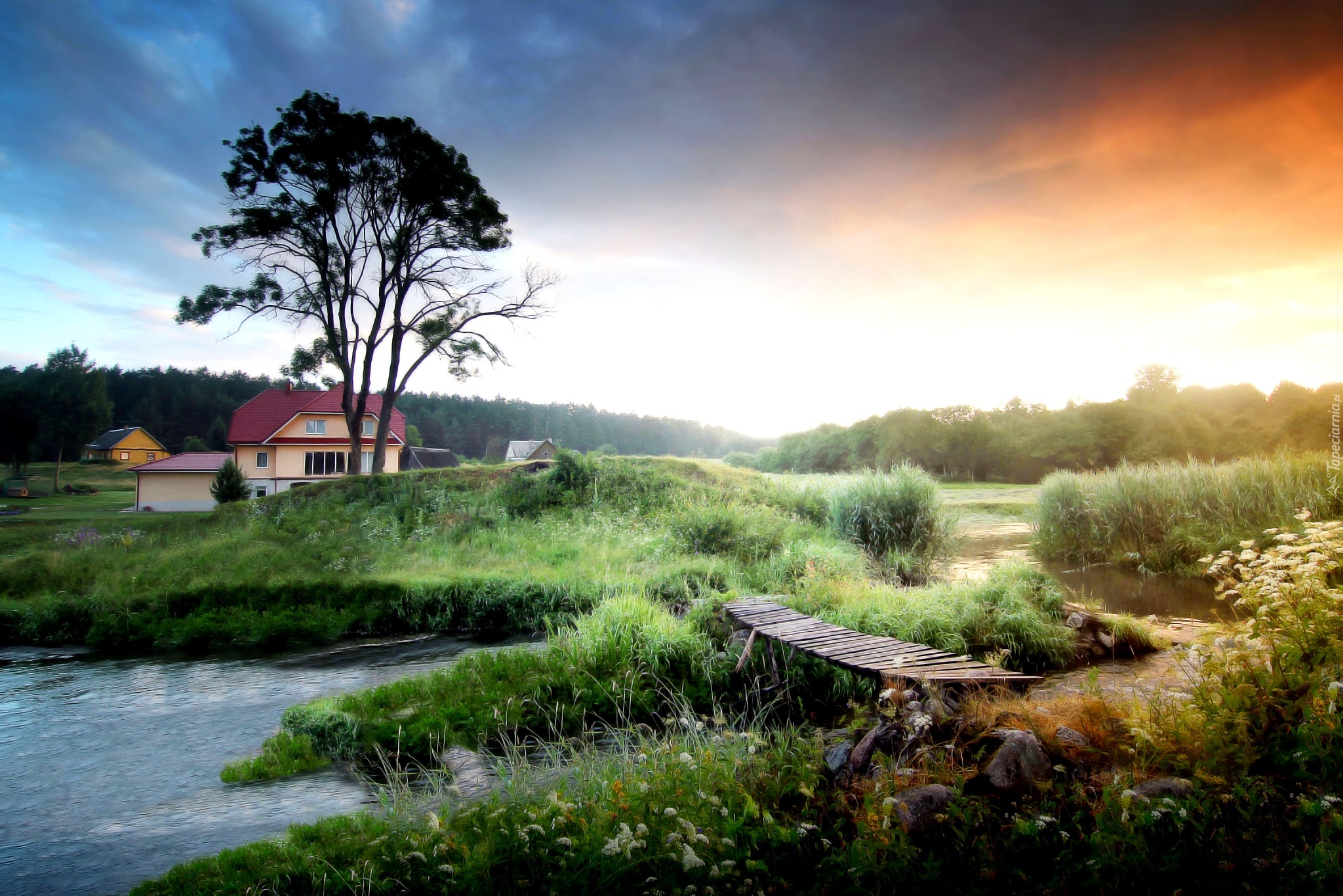 Edytor tapety: Rzeczka, Kładka, Dom, Trawy, Drzewa