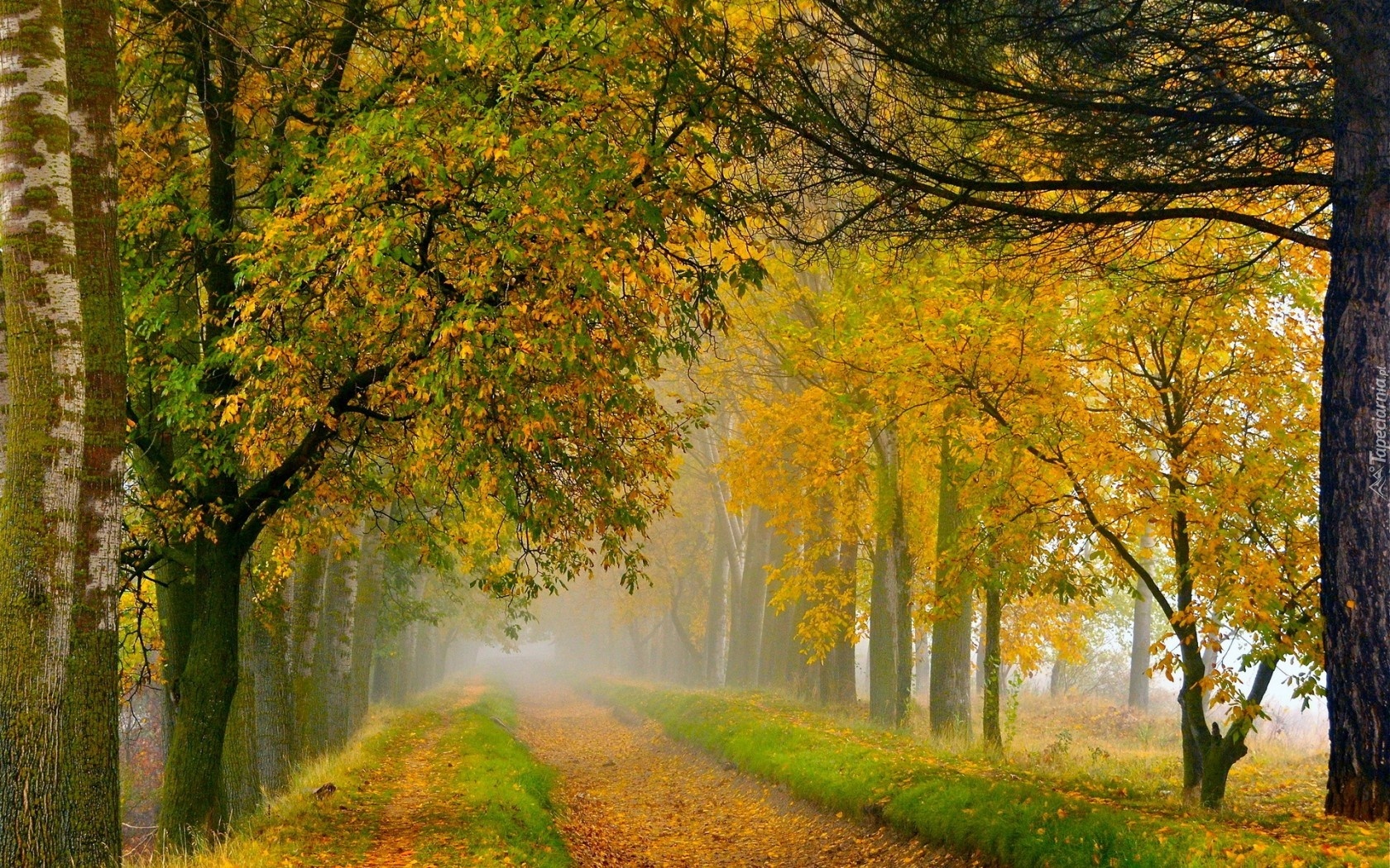 Edytor tapety: Droga, Las, Liście, Mgła, Jesień