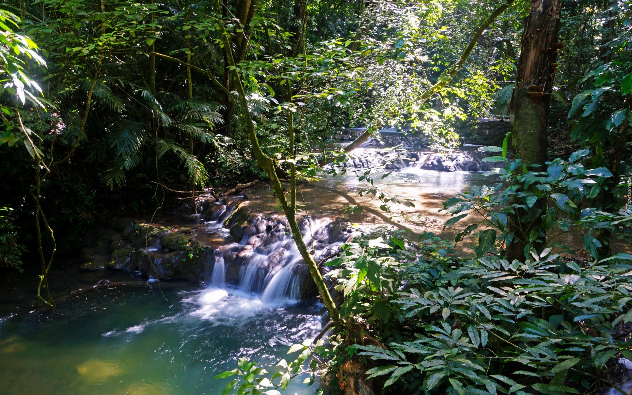 Edytor tapety: Wodospad, Las, Palmy, Krzewy, Przebijające, Światło