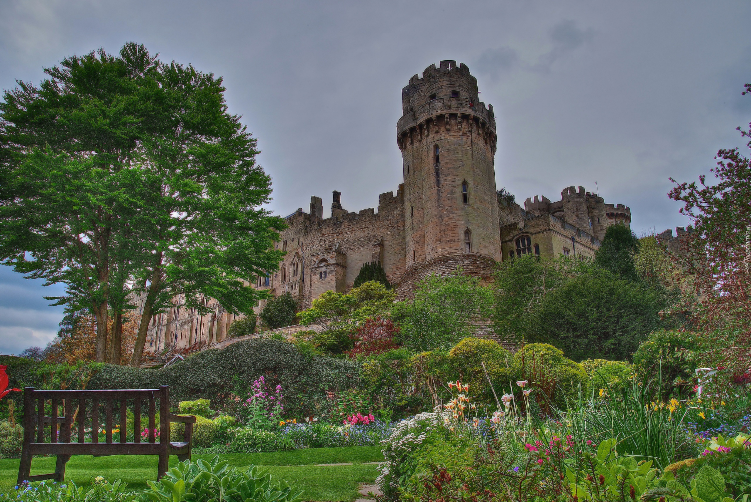 Edytor tapety: Zamek w Warwick, Anglia, Ławka, Ogród