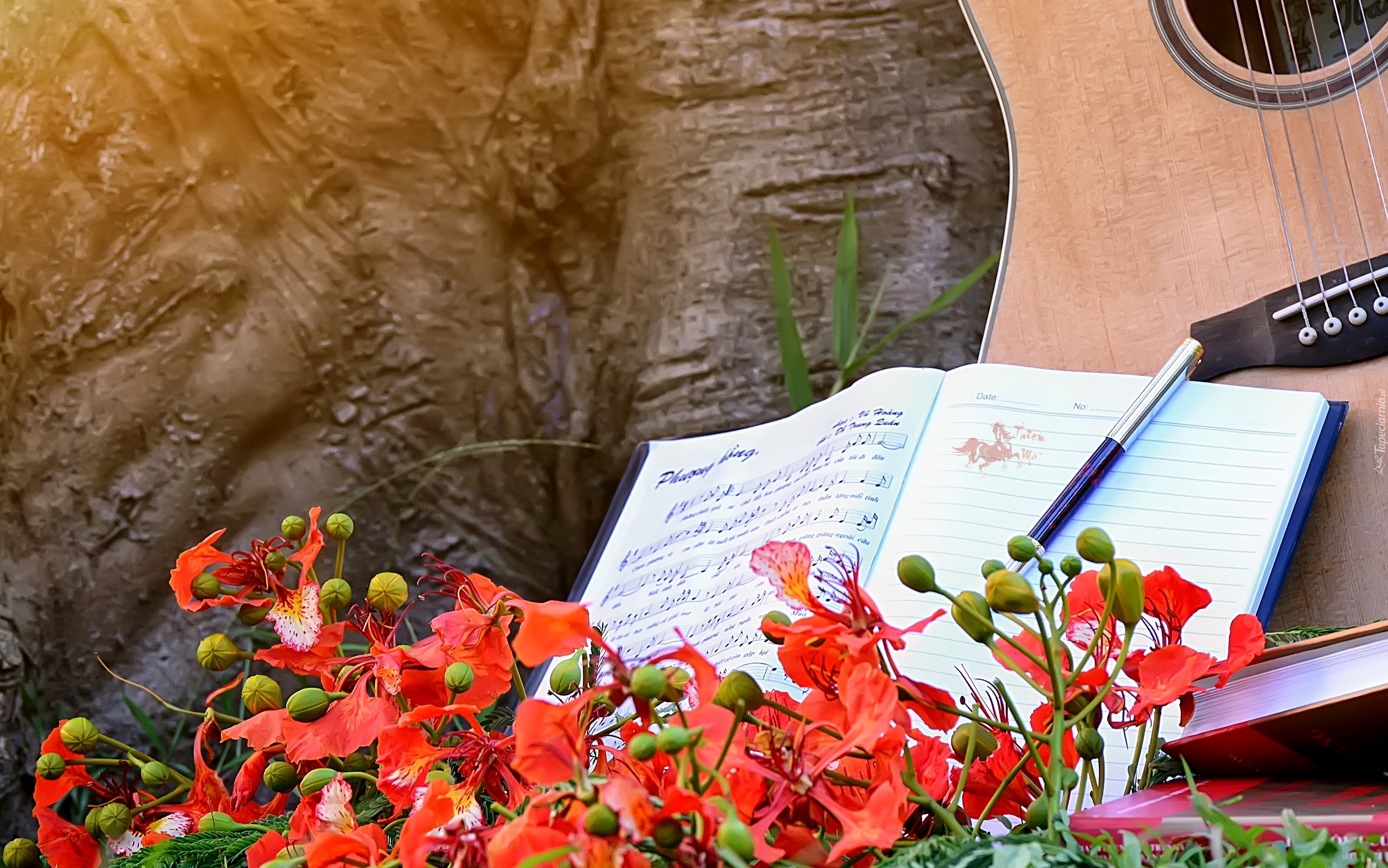 Edytor tapety: Gitara, Książka, Czerwone, Kwiaty