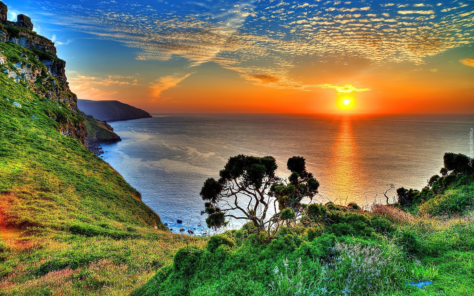 Edytor tapety: zachód, Słońca, Morze, Góry, Roślinność, Drzewa