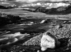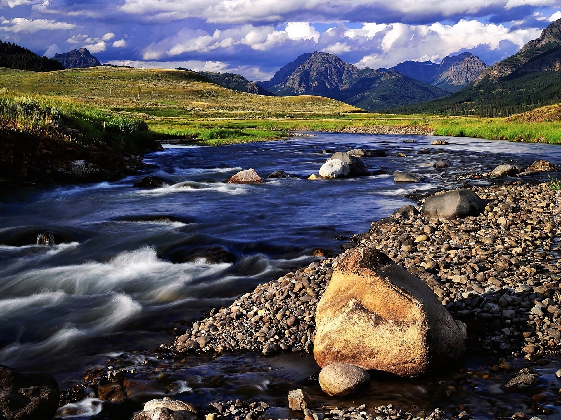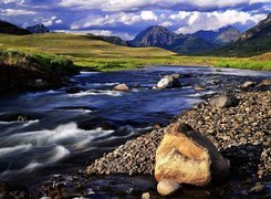Edytor tapety: Góry, Łąka, Rzeka, Kamienie, Obłoki