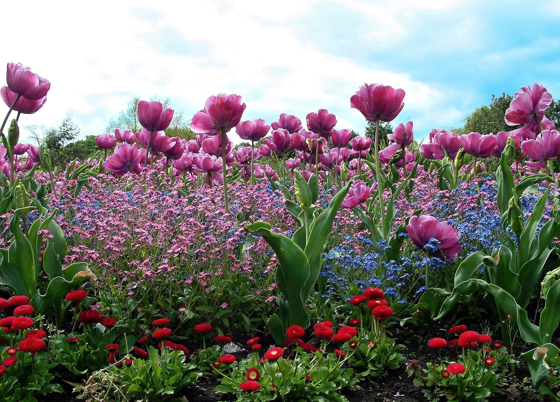 Edytor tapety: Wiosna, Ogród, Kolorowe, Kwiaty, Obłoki