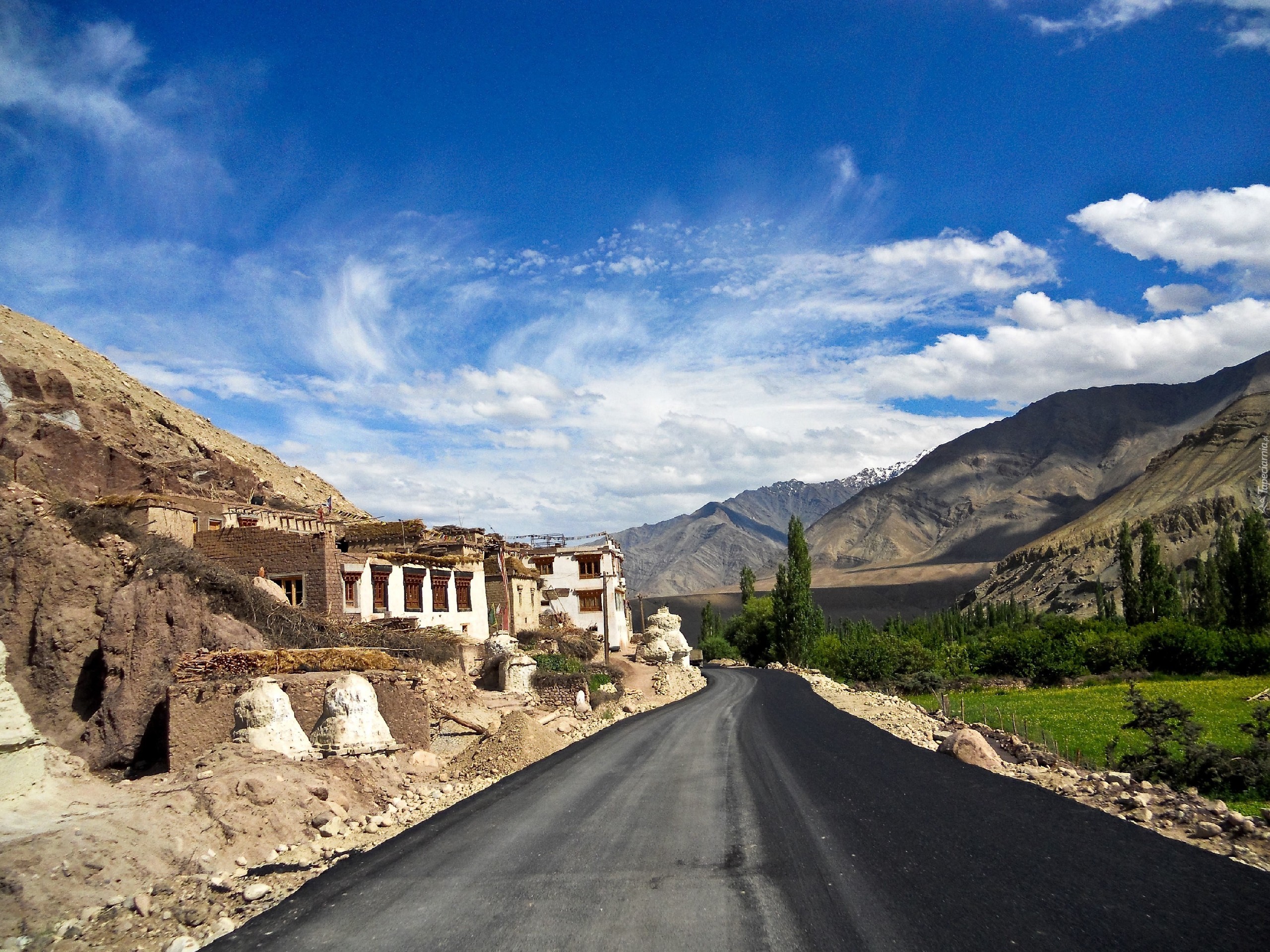 Edytor tapety: Droga, Góry, Domy