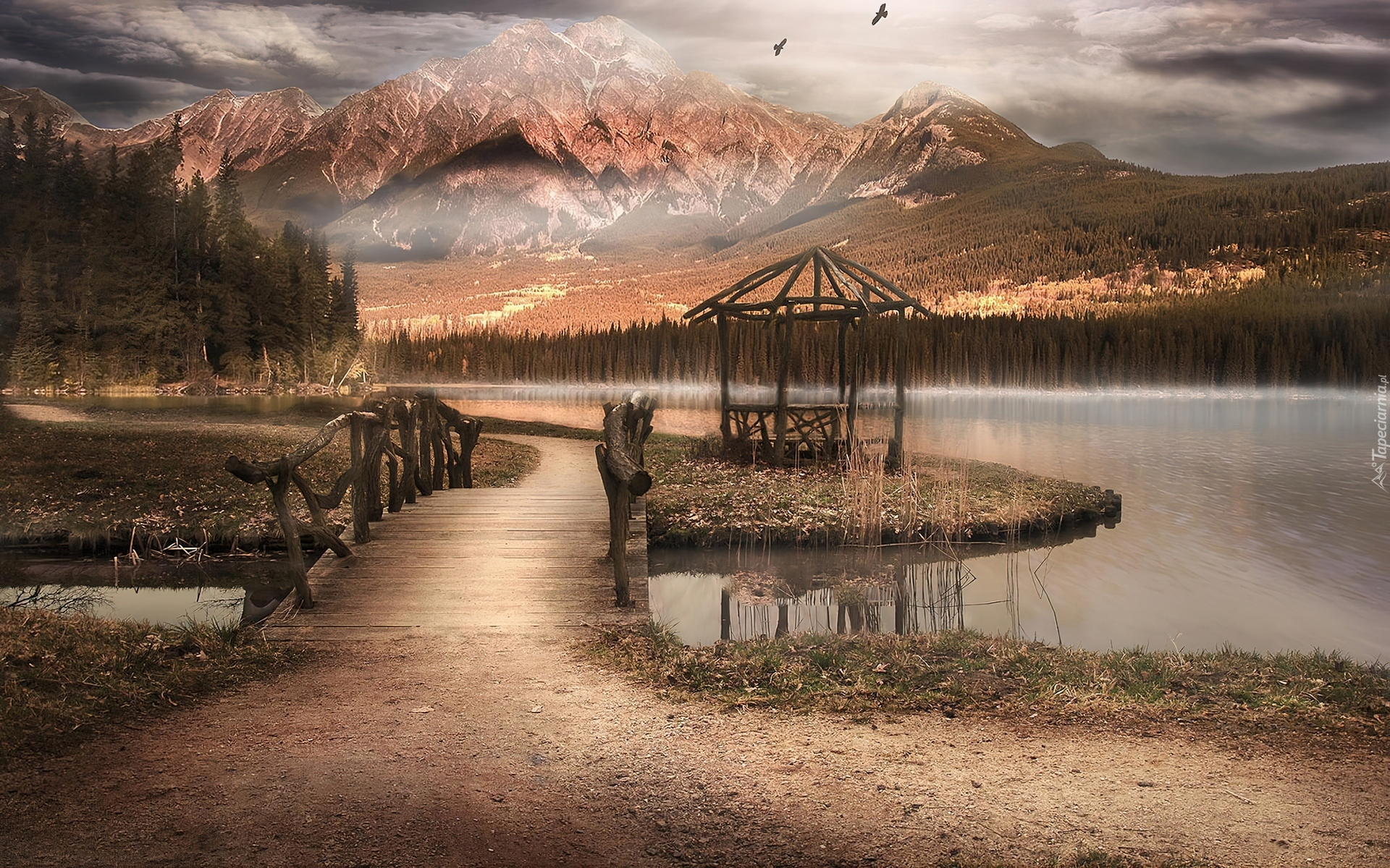Edytor tapety: Góry, Jezioro, Molo, Ptaki