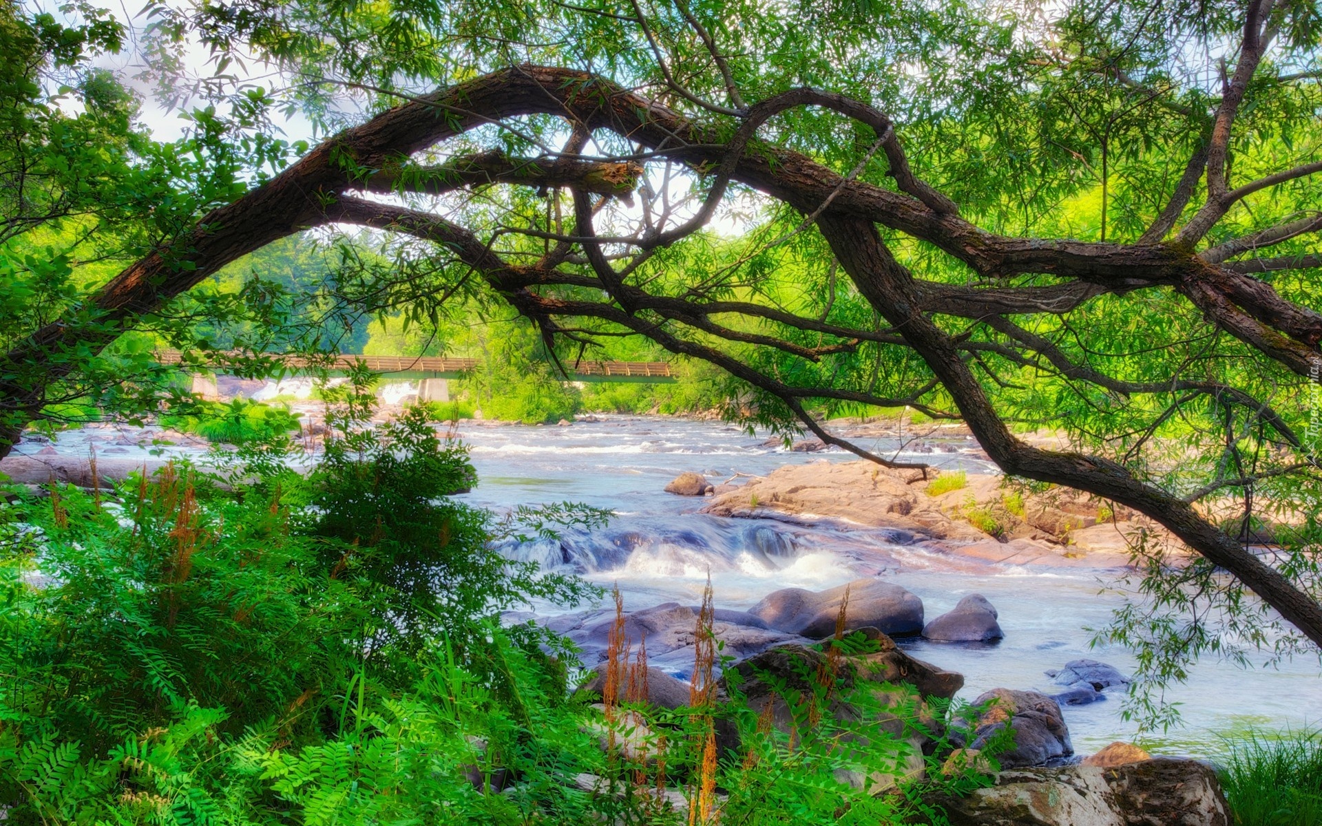 Edytor tapety: Rzeka, Kamienie, Paprocie, Most, Wiosna
