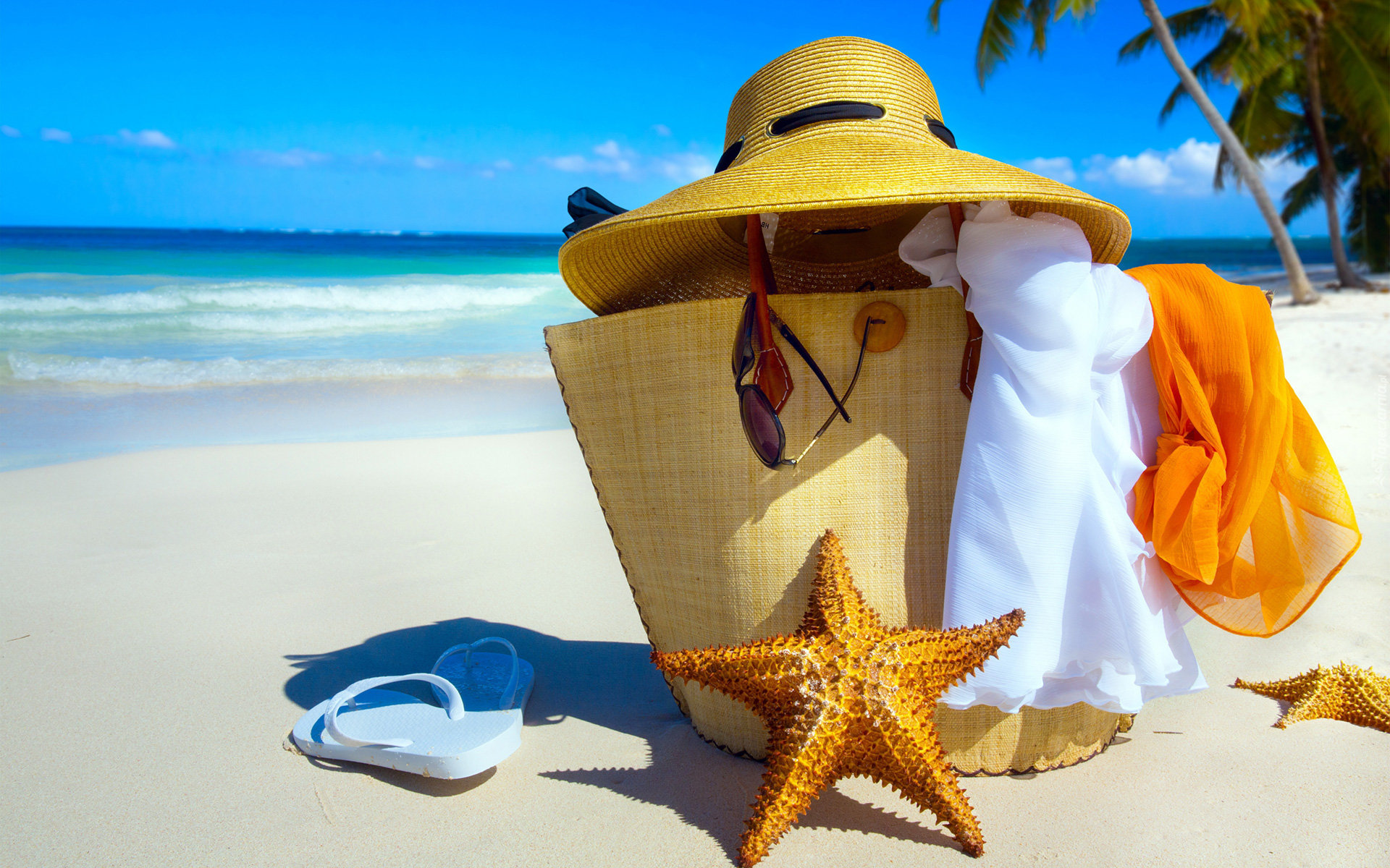 Edytor tapety: Plaża, Morze, Palmy, Koszyk, Kapelusz, Muszle, Tropiki, Lato