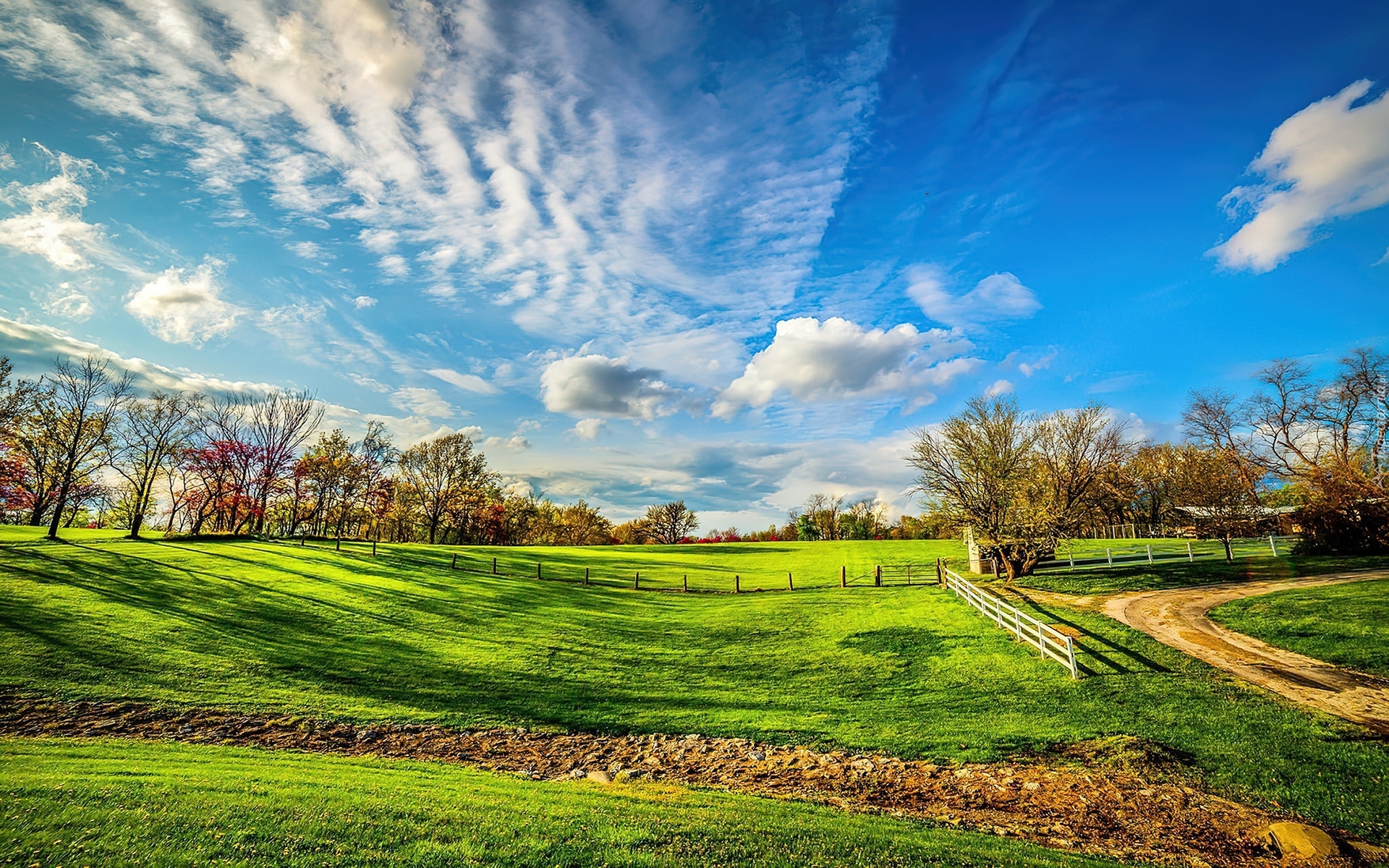 Edytor tapety: Wieś, Pola, Droga, Chmury, Drzewa