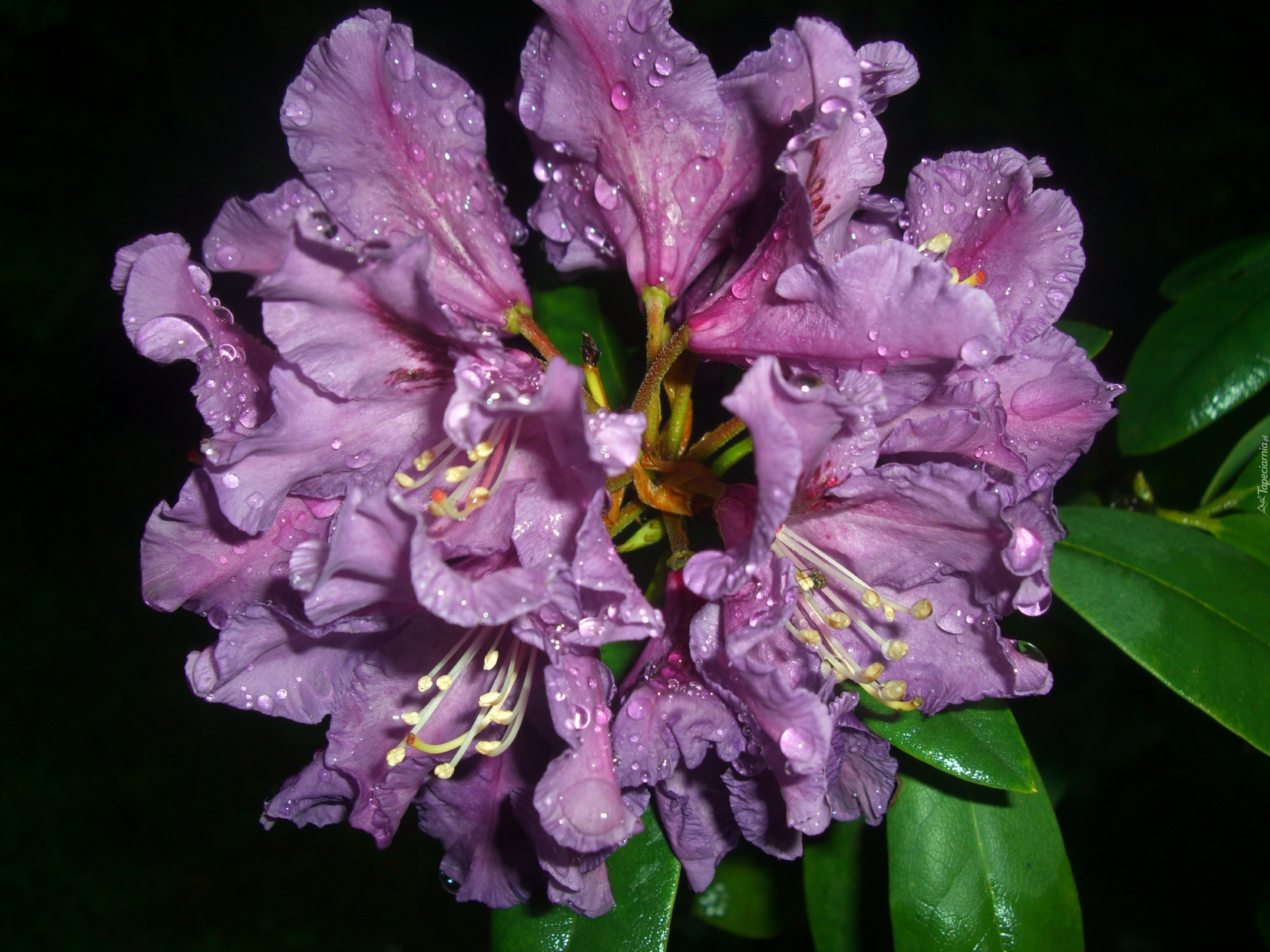 Edytor tapety: Rododendron, Kwiaty, Fiolet, Liście, Krzew, Krople, Deszczu