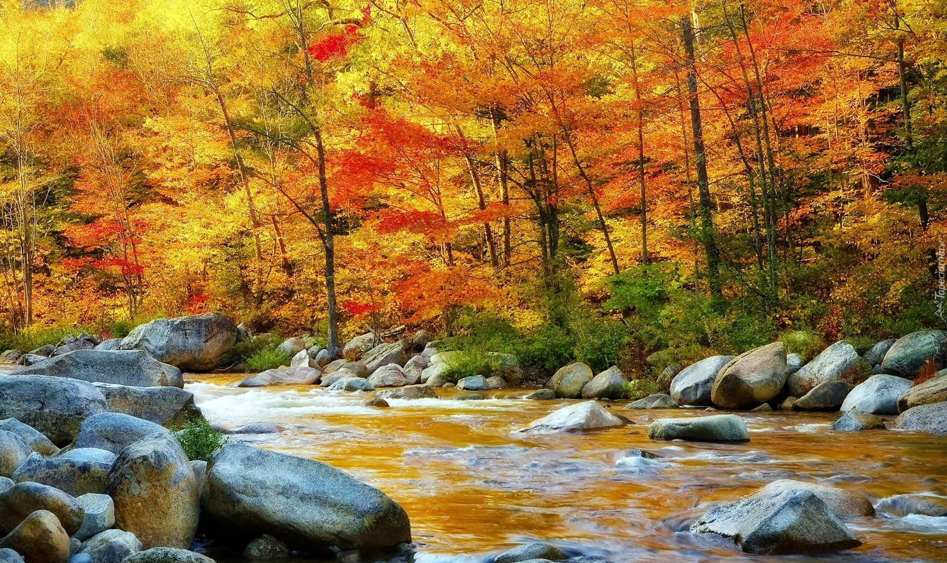 Edytor tapety: Jesień, Rzeka, Głazy, Las