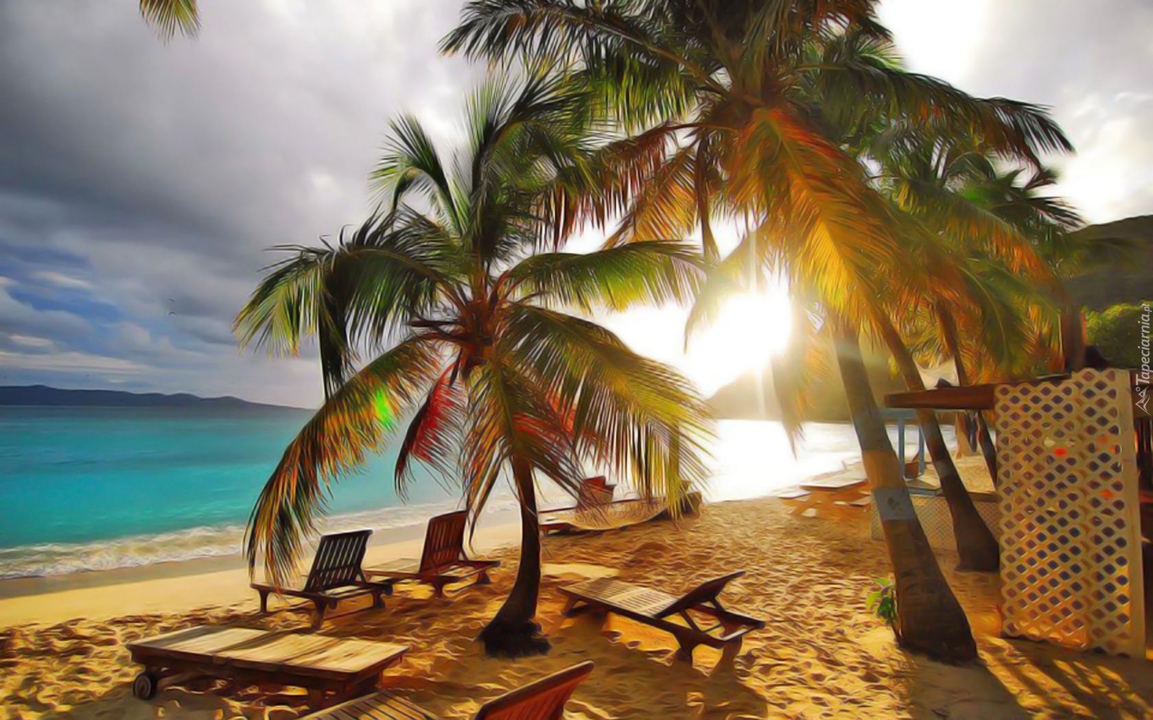 Edytor tapety: Morze, Plaża, Palmy, Przebijające, Światło, Leżaki, Wakacje