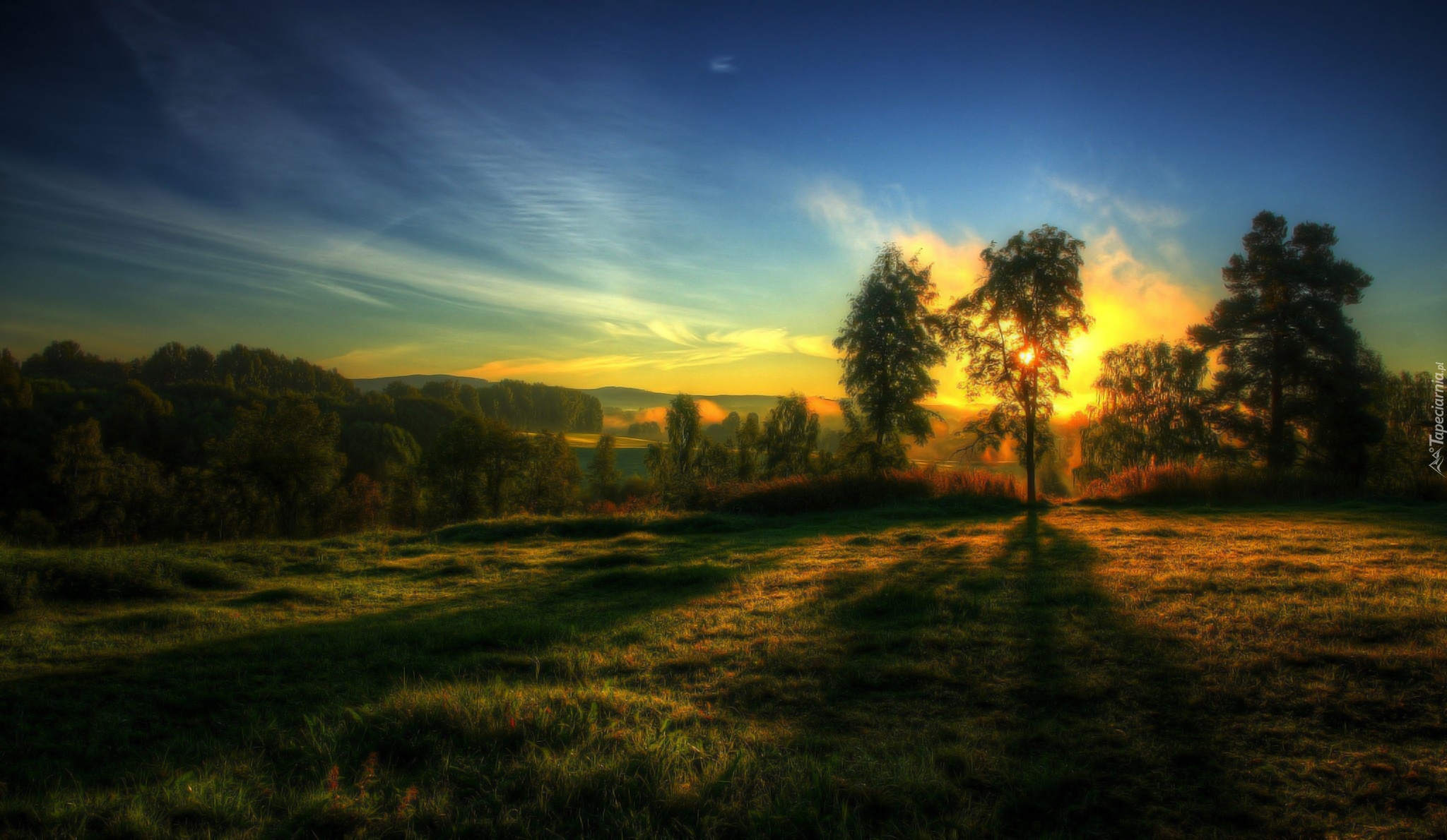 Edytor tapety: Zachód, Słońca, Łąki, Drzewa