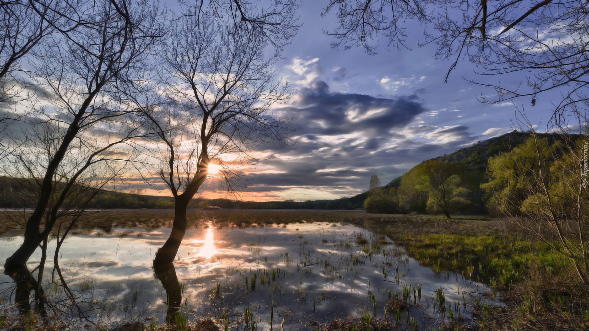 Edytor tapety: Słońce, Drzewa, Łąka, Bagna