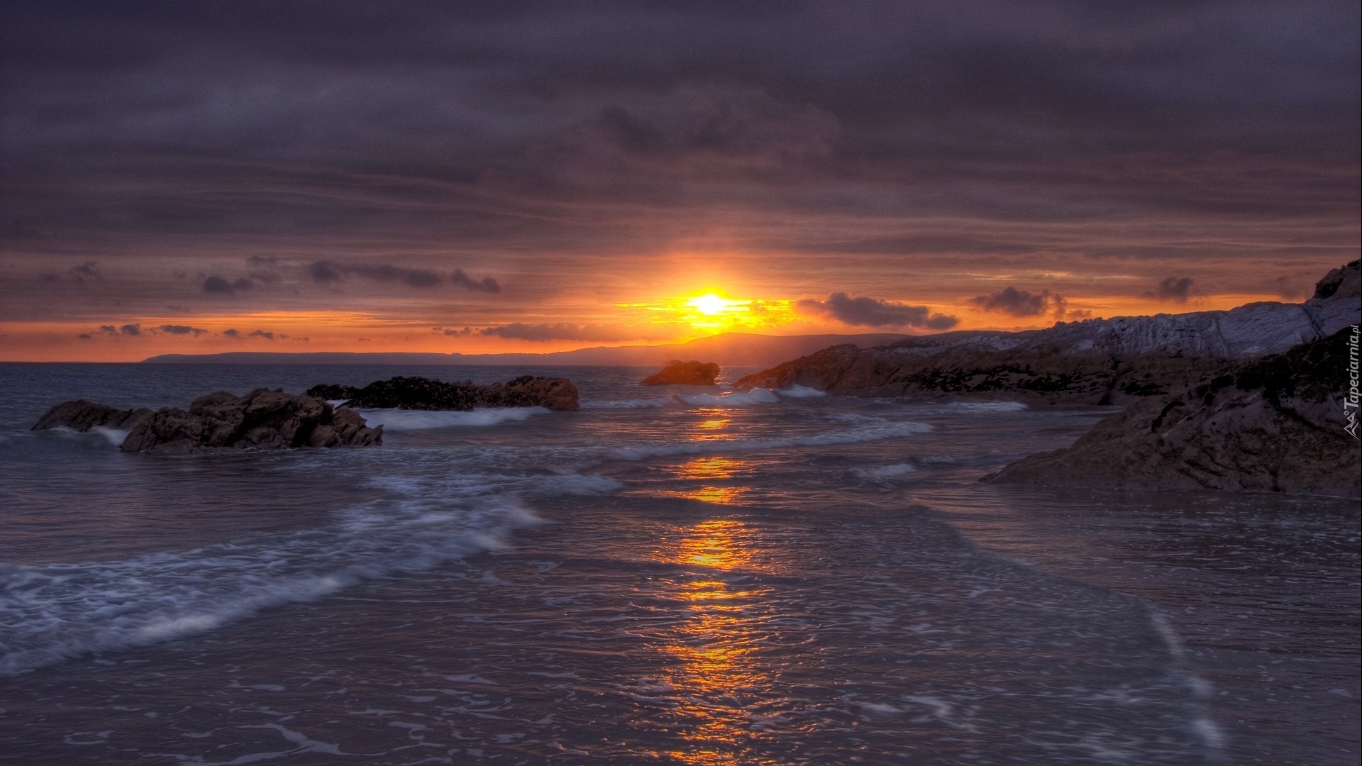 Edytor tapety: Wybrzeże, Skały, Fale, Chmury, Zachód, Słońca