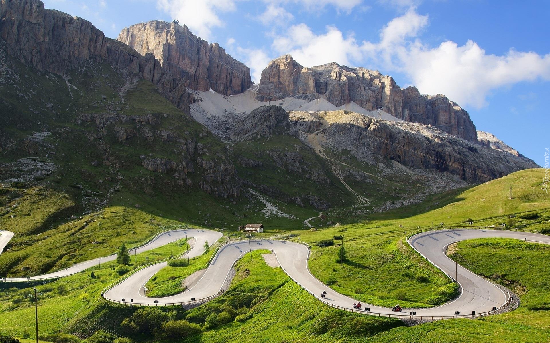 Edytor tapety: Góry, Dom, Droga, Serpentyny, Motocykle