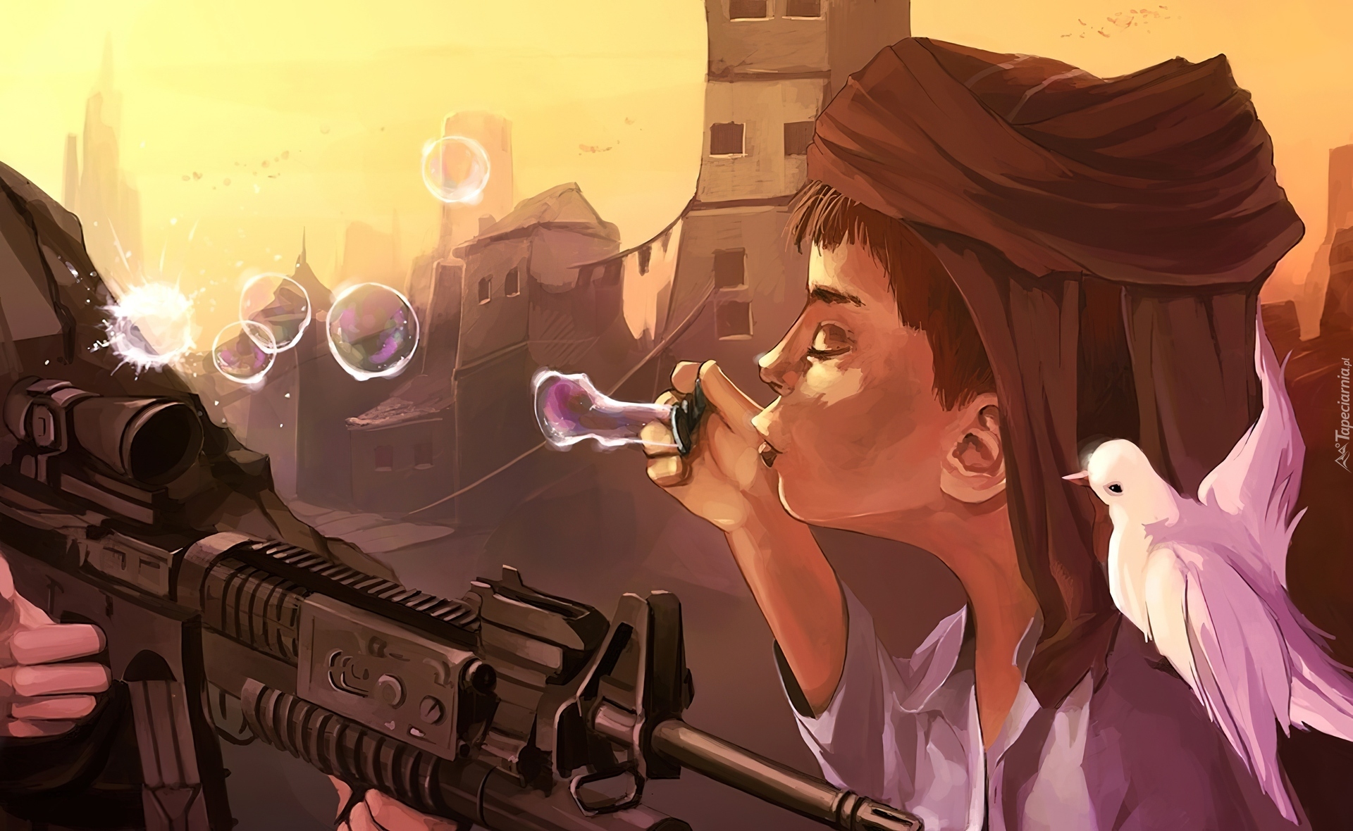 Edytor tapety: Cyril Rolando, Chłopiec, Gołąb, Karabin, Bańki